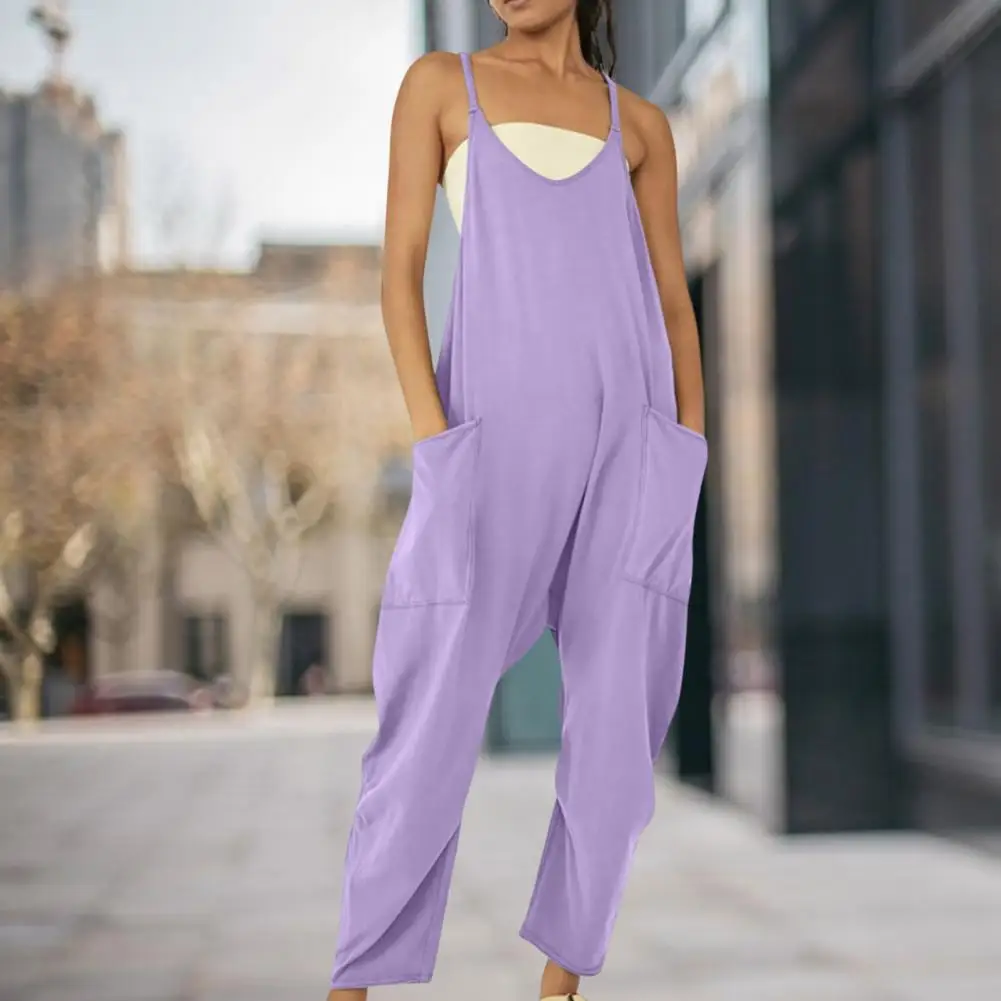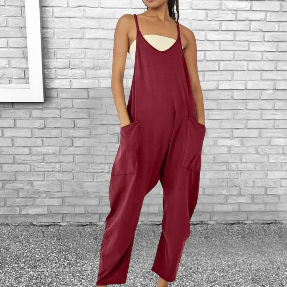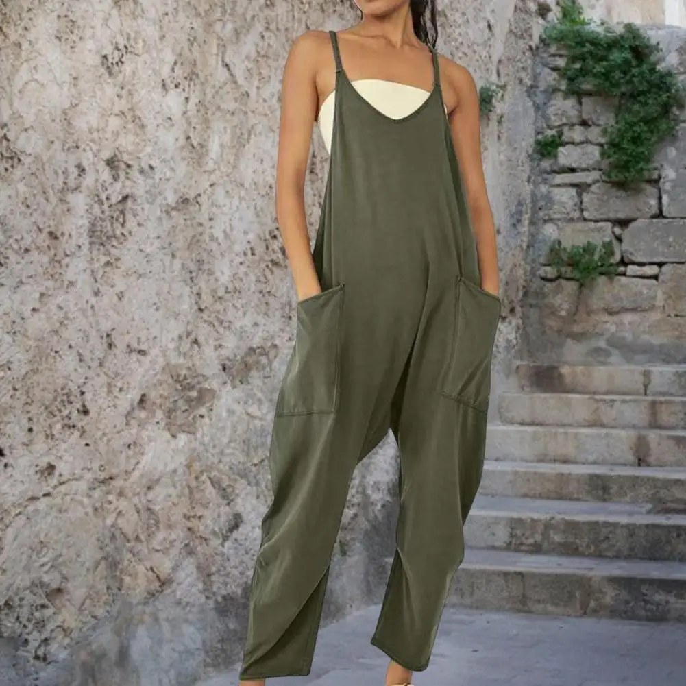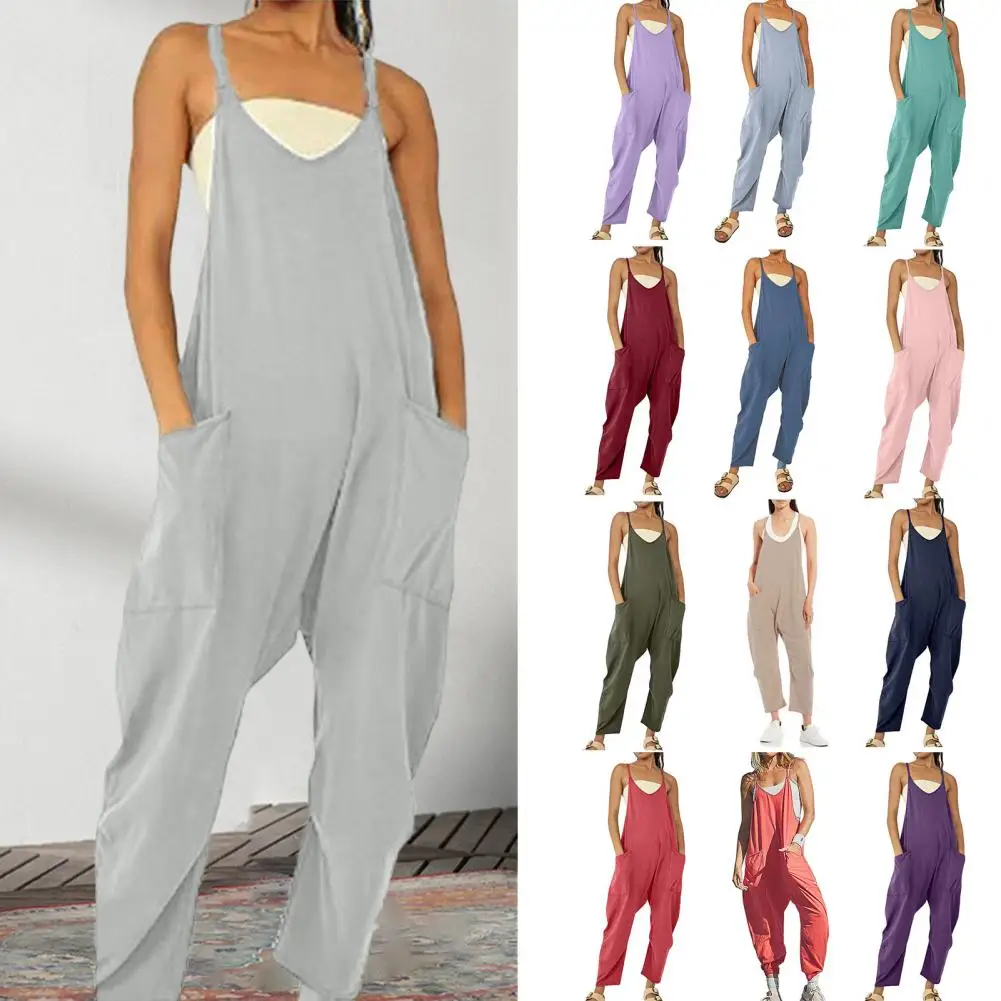 Women Casual Jumpsuit Summer Solid Loose Wide Leg Pants Overalls Fashion Pocket Sleeveless Strap Baggy Streetwear Rompers