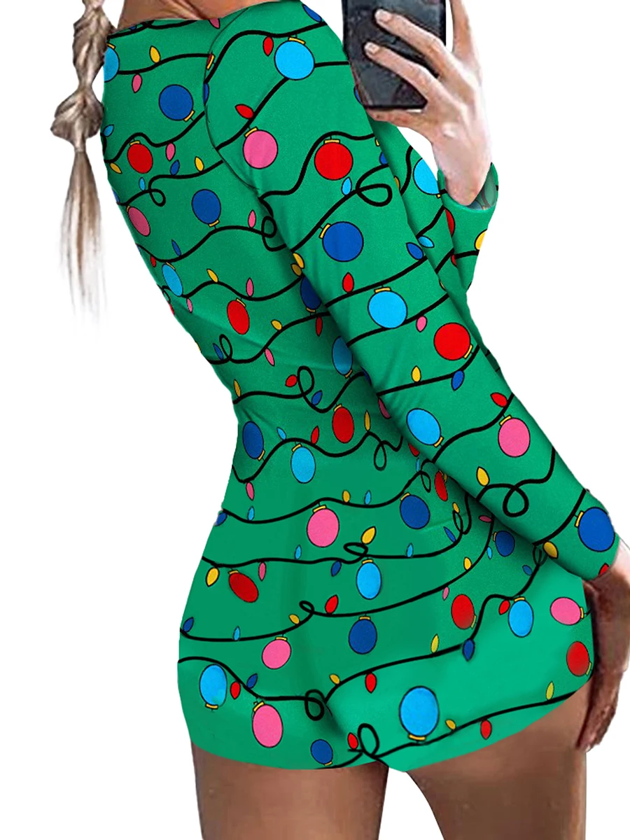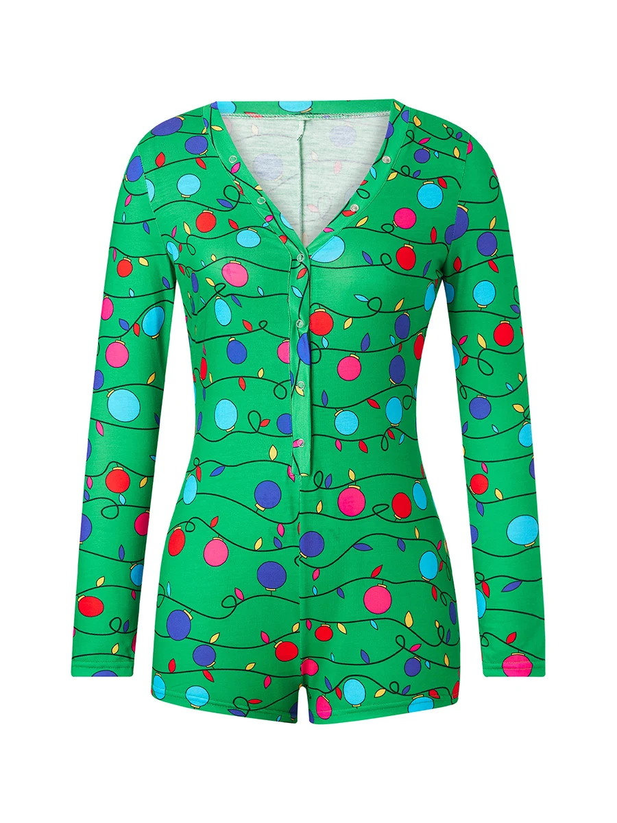 Christmas Jumpsuit Romper Women Sexy Long Sleeve Button V Neck Bodycon Bodysuit Overall Pajamas