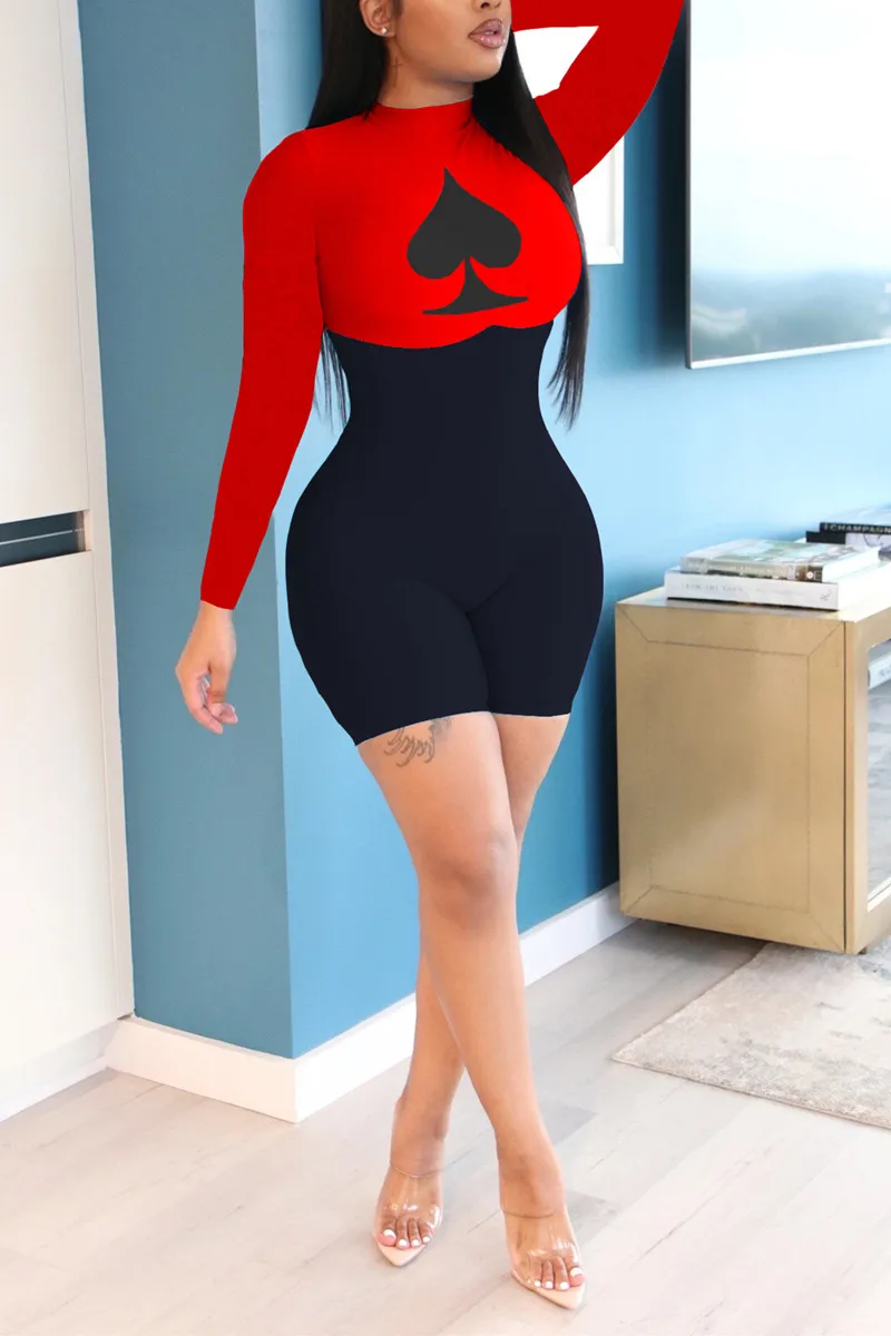 Fashion Women Casual Queen Spades Print Bodycon Rompers Autumn Jumpsuit Shorts Sexy Outfits For Woman Playsuit Party Clubwears