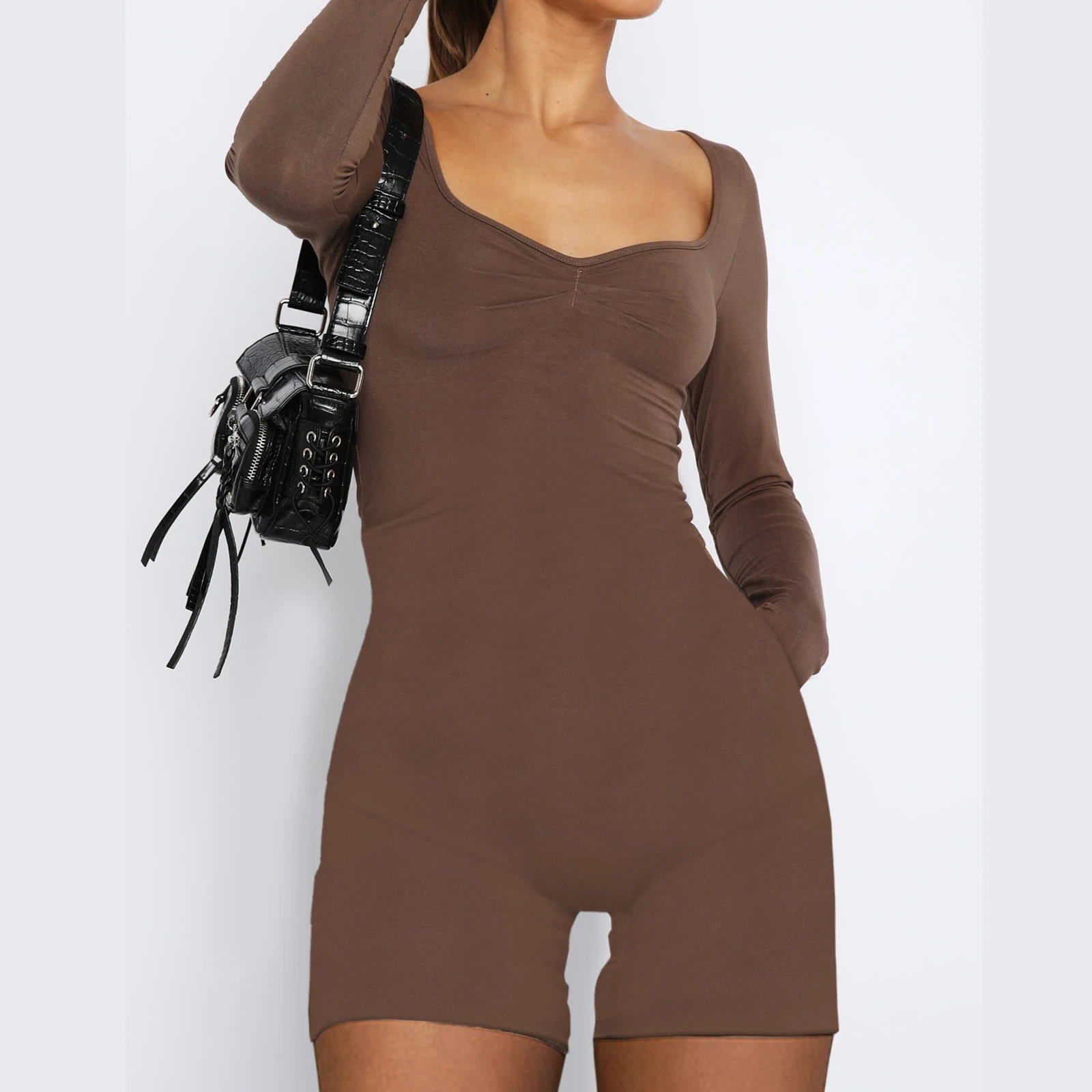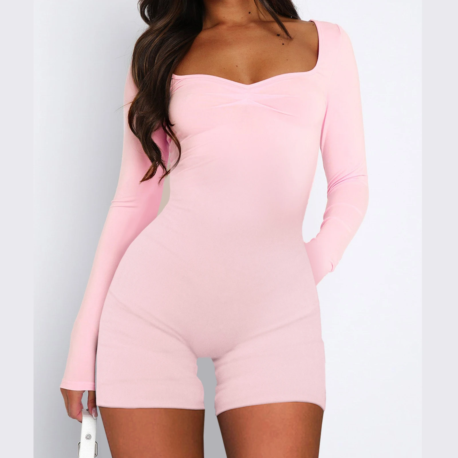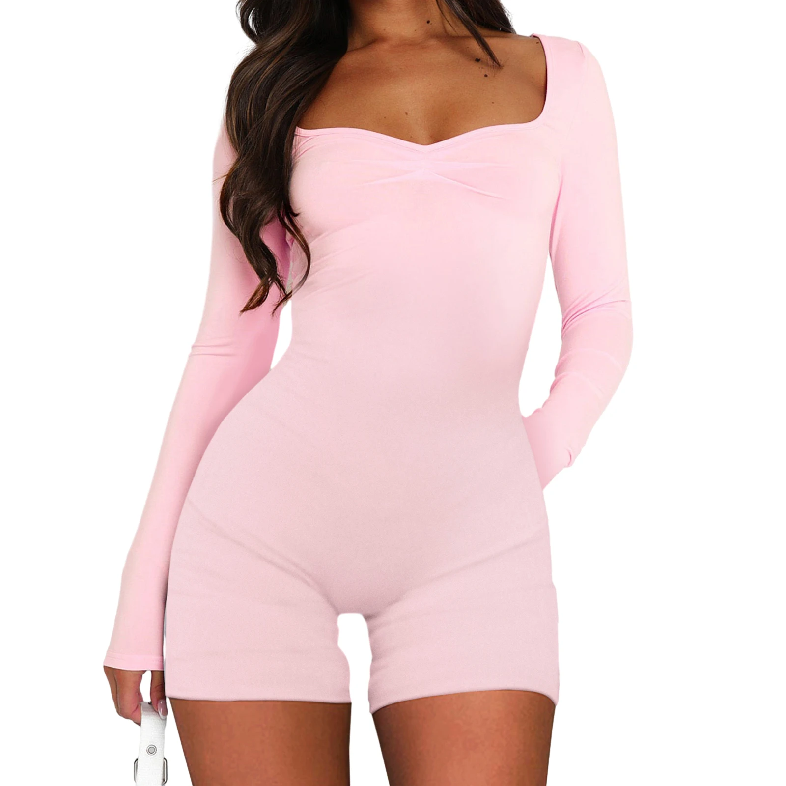 Women’s Sweetheart Neck Rompers Long Sleeve Ruched Front Solid Color Jumpsuit Shorts Fall Loungewear