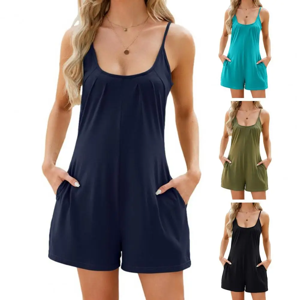 Women Summer Romper Low-cut Backless Sleeveless Loose Women Romper Side Pockets Deep Crotch Casual Sport Homwear Romper