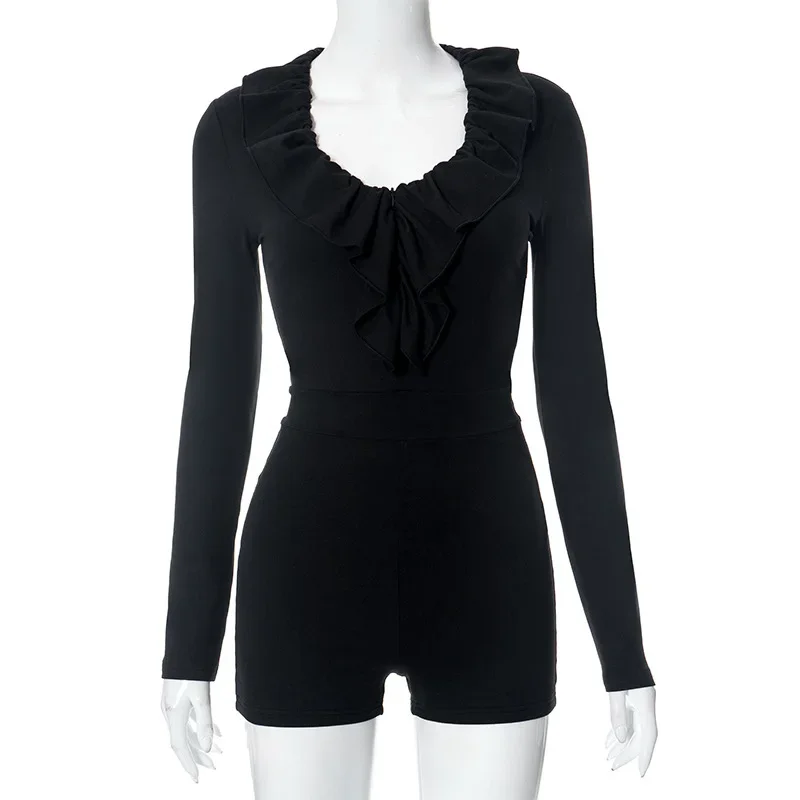 Women Spring Casual Slim Long Sleeve O-Neck Playsuit Lady Streetwear Flounce Solid Black Sexy Rompers for Women Bodycon Shorts