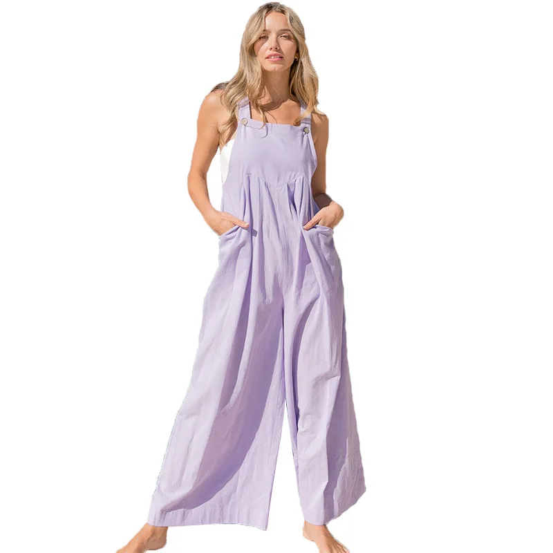 Ankle Length Jumpsuits Women Wide Leg Rompers Spliced Overalls Pockets One Piece Mid Waist Solid Casual Loose Fit 2024