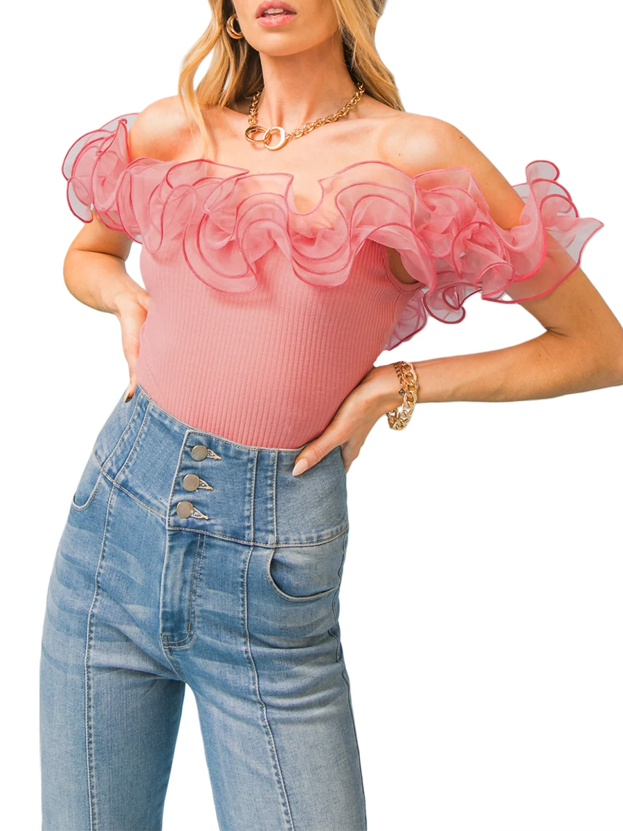 Women’s Chic Elegant Off Shoulder Bodysuit Sleeveless Organza Ruffle Solid Color Slim Fit Leotard Tops Clubwear