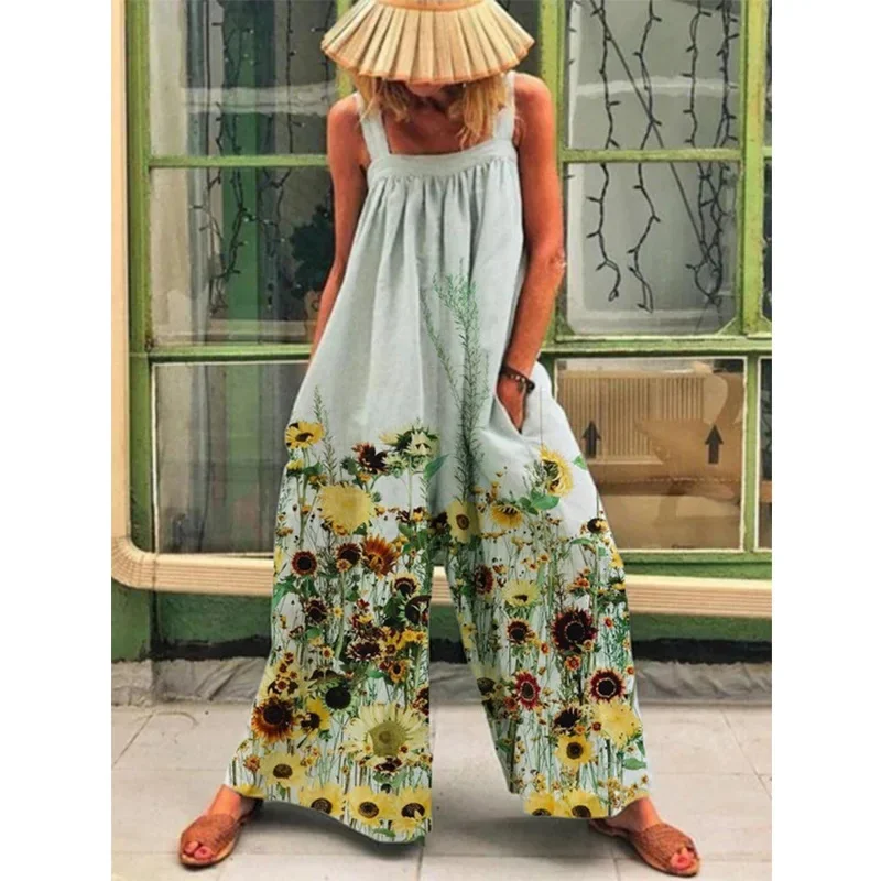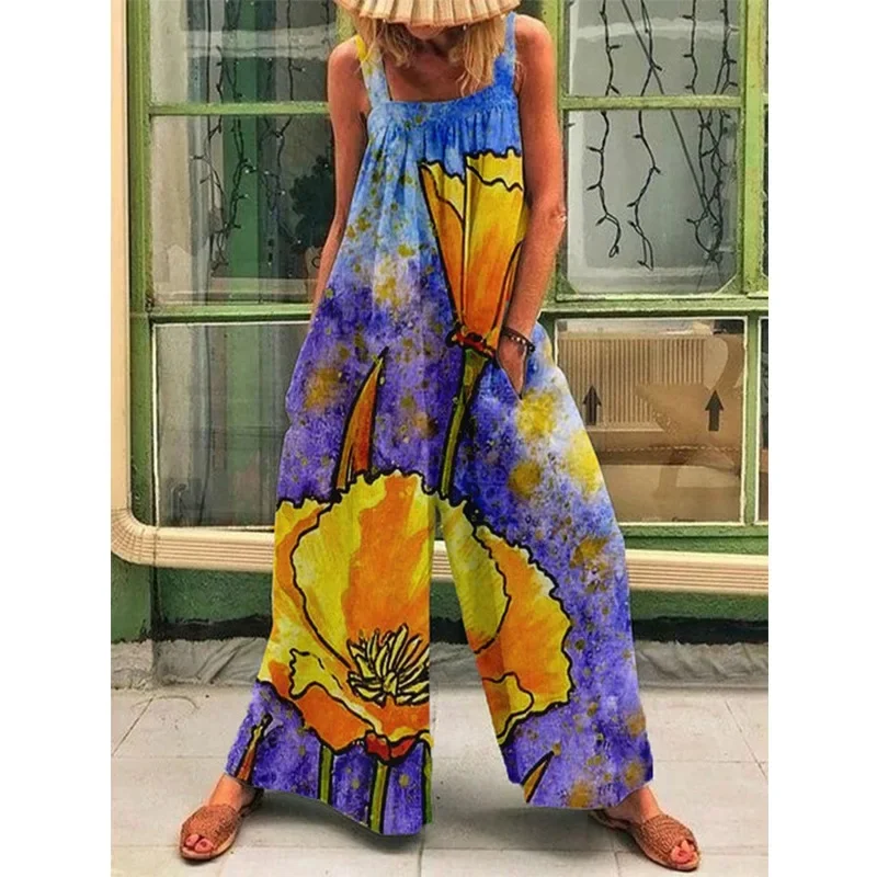 2023 Summer Women Jumpsuit Loose Leisure Textile Printing Strap Wide Leg Pants Office Lady Rompers Patchwork Outwear