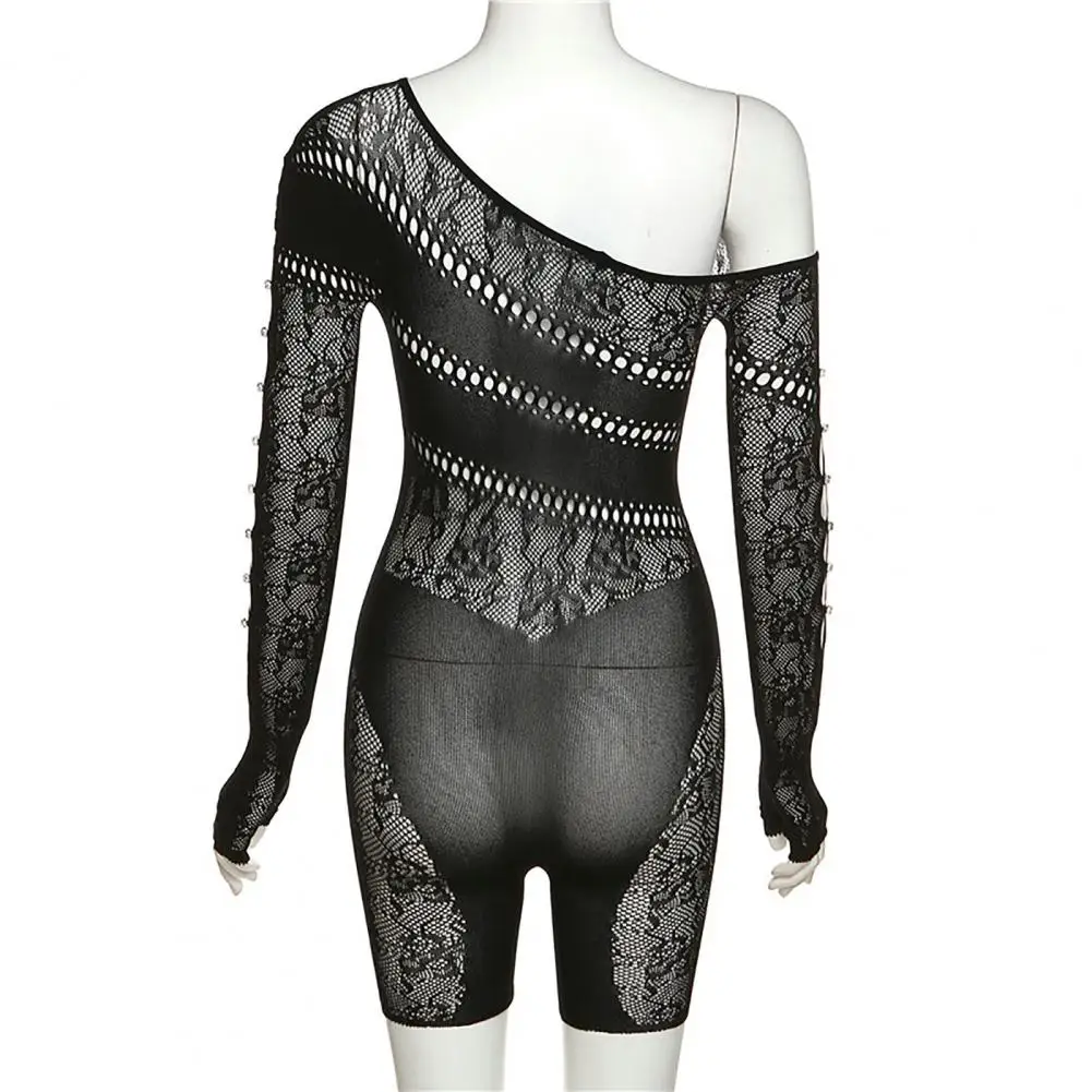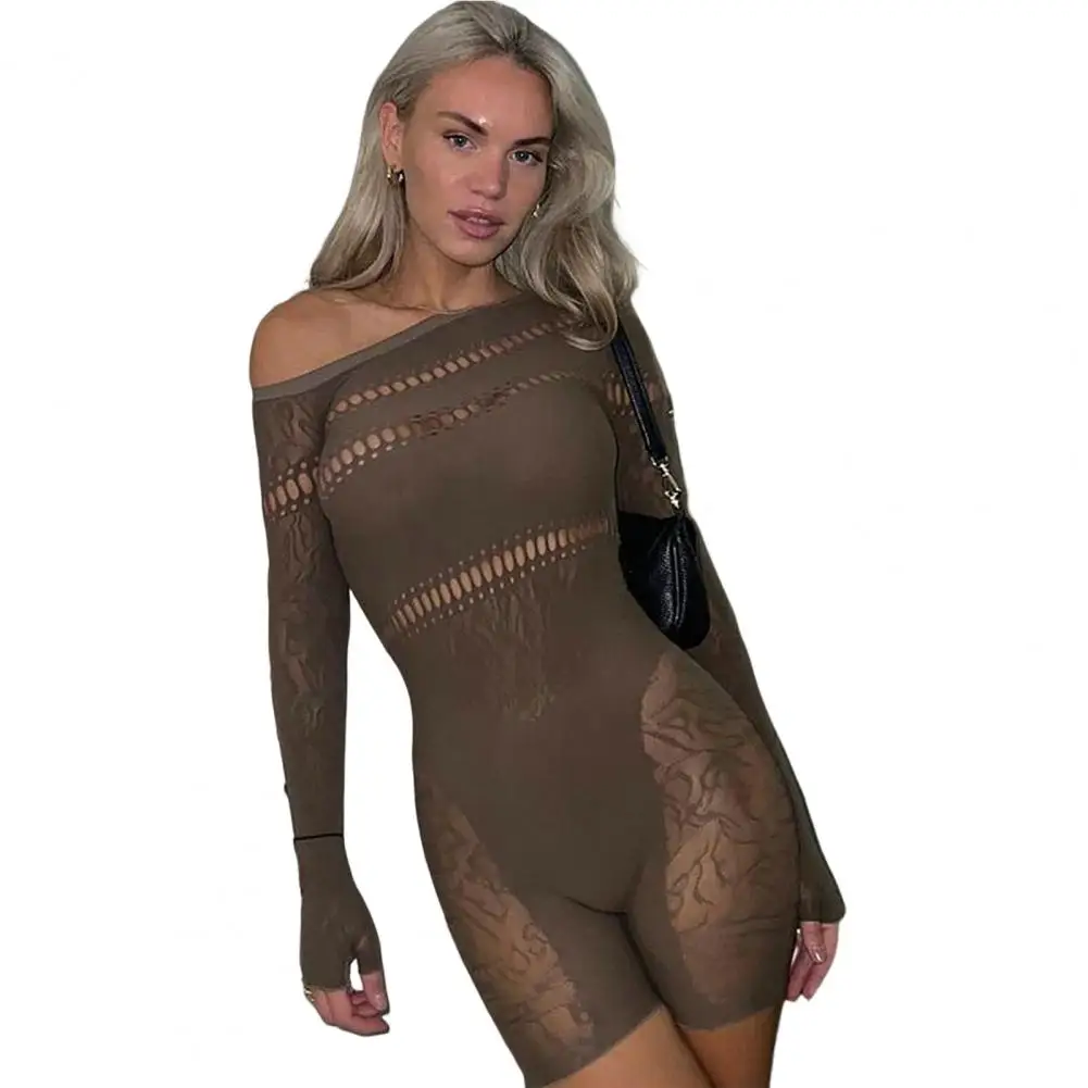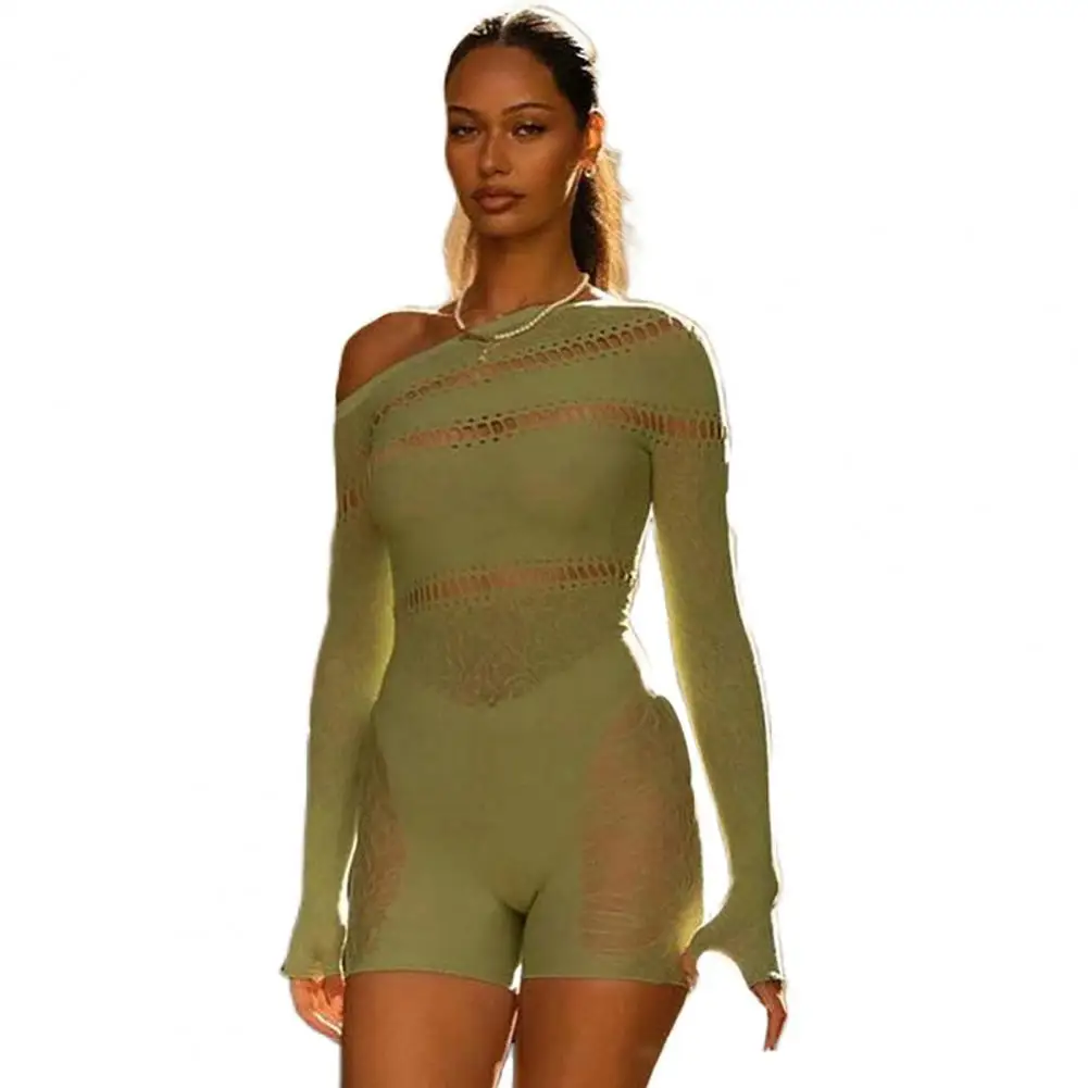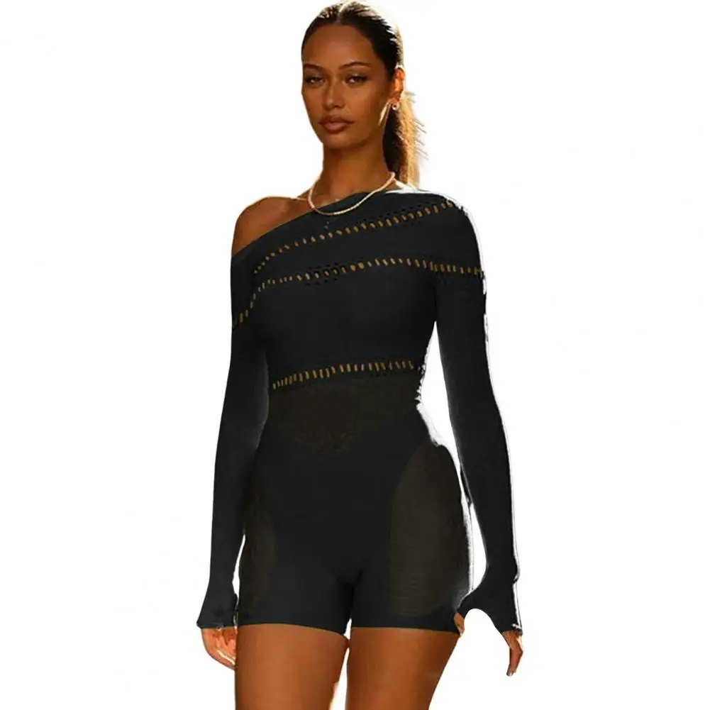 Romper Playsuit Women Solid Color Slash Neck Hollow Out See Through Streetwear Sexy Net Yarn Romper Playsuit Women Clothing