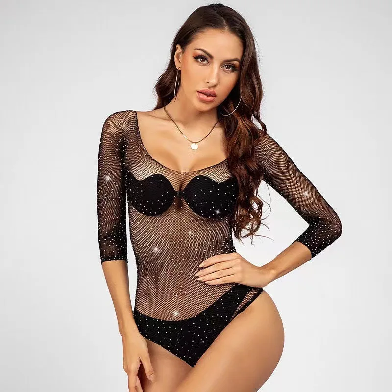 Women's Clothing Summer 2023 Elegant Sexy Bodysuit Bright Diamond Fishnet Porno Bodysuits See Through Sequin Long Sleeve Tights