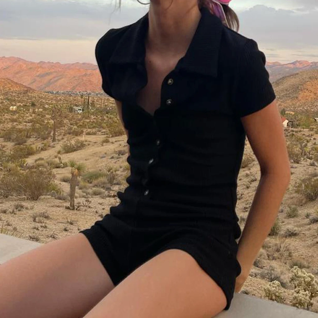Women's y2k Summer Jumpsuit Summer Solid Color Slim Lapel Short Sleeve Jumpsuit Black Casual Sportswear