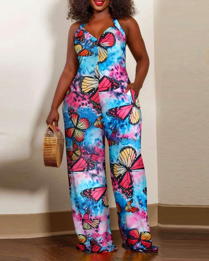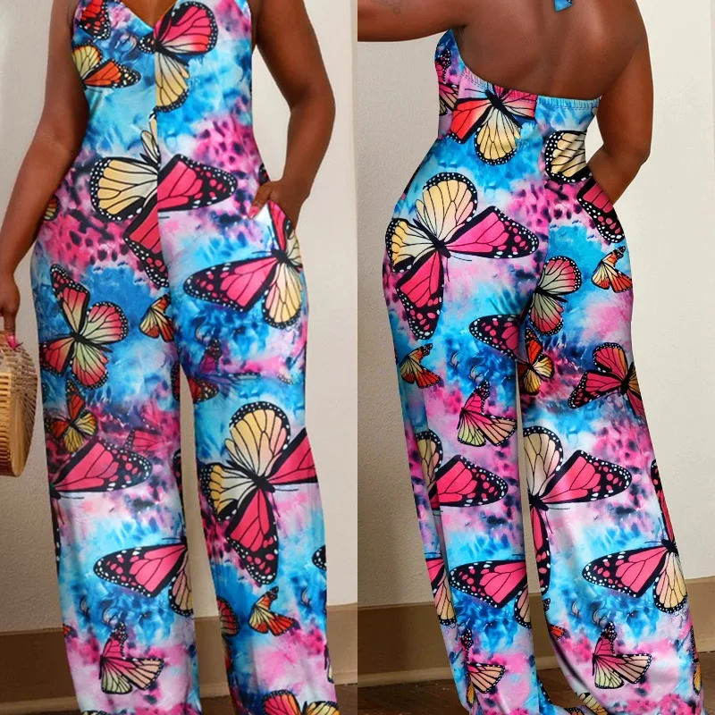 One Piece Women Print Jumpsuits Halter Lace Up Overalls Loose Casual Sleeveless Wide Leg Long Pants Backless Rompers Summer