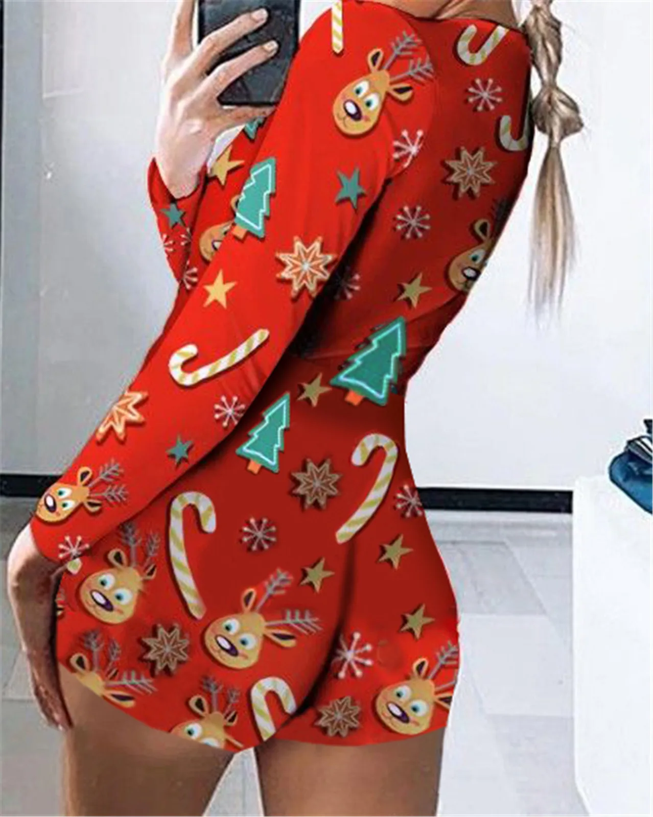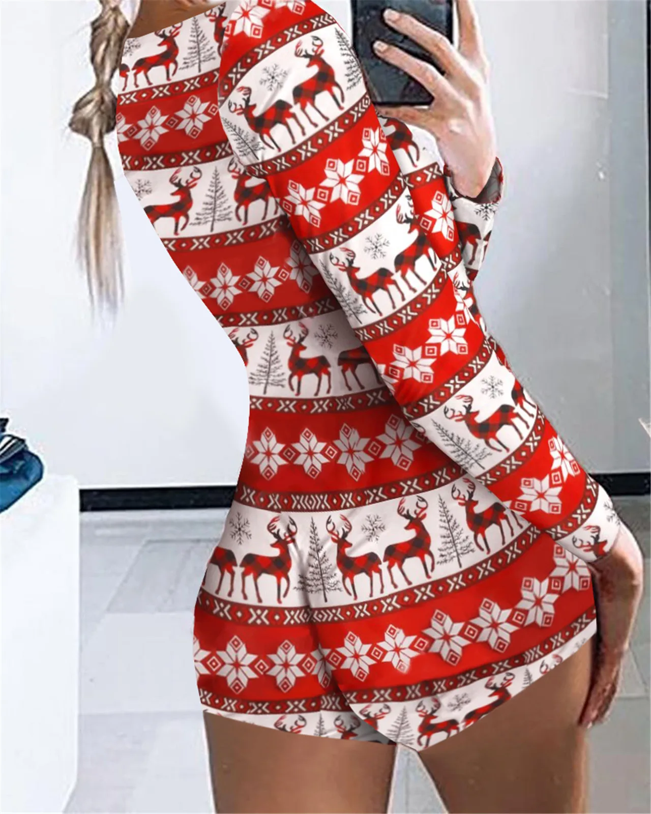 Womens Sexy Christmas Romper Bodysuit Long Sleeve Bodysuit Pajamas Stretch Shorts Jumpsuit Party Oufit