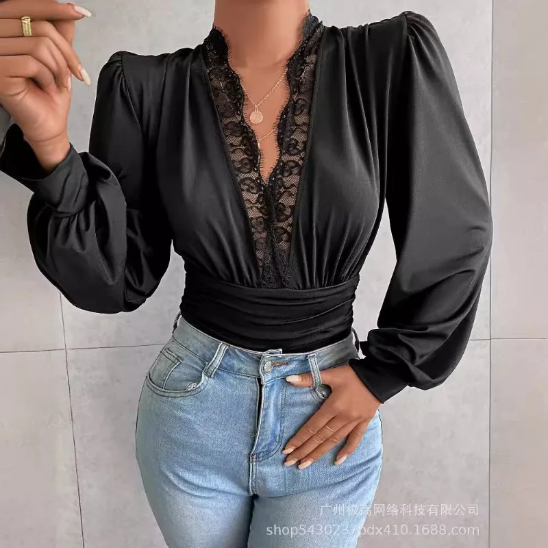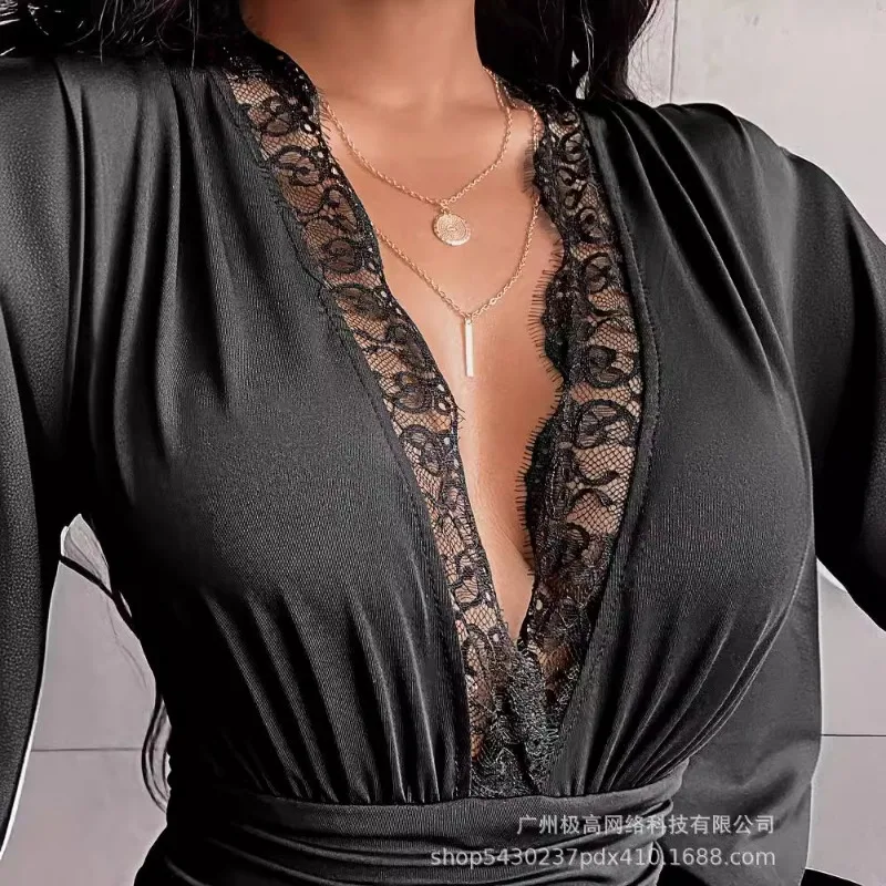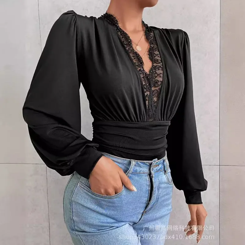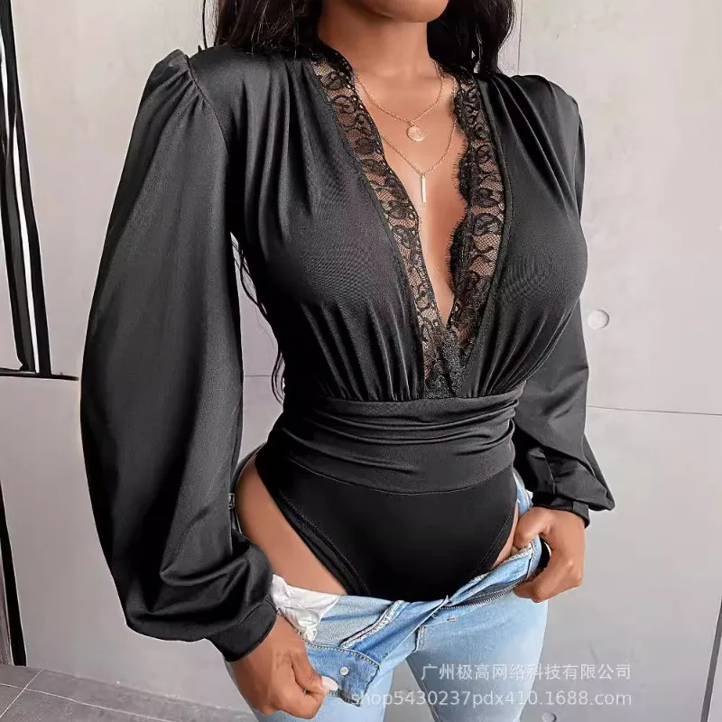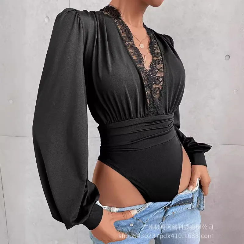 2024 Spring Summer New Women's Clothing Solid Color V-neck Long-Sleeved Lace Jumpsuit