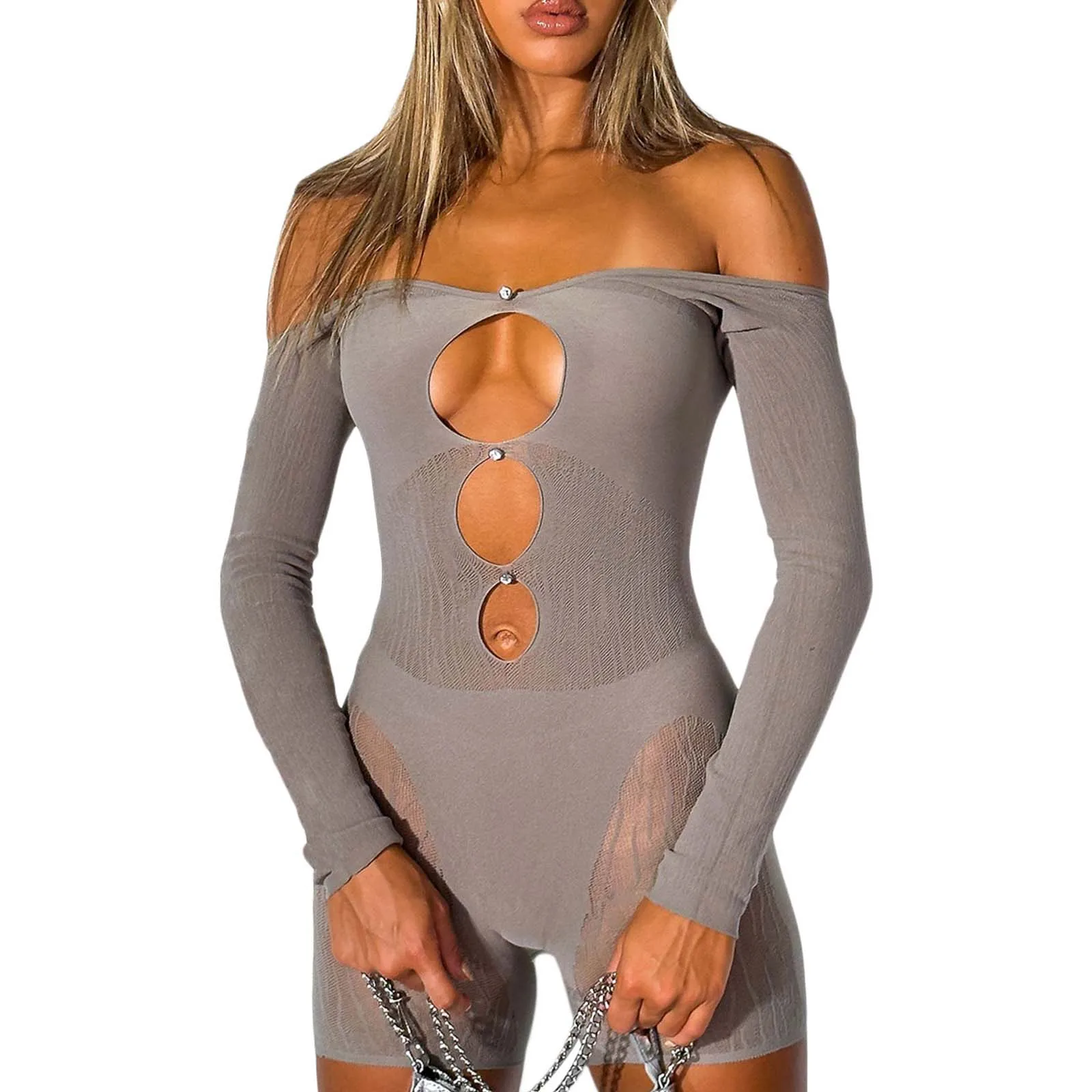 2024 Fashion Women Off-shoulder Jumpsuit Casual Cutout Long Sleeve Bodysuit Playsuit Clubwear Streetwear
