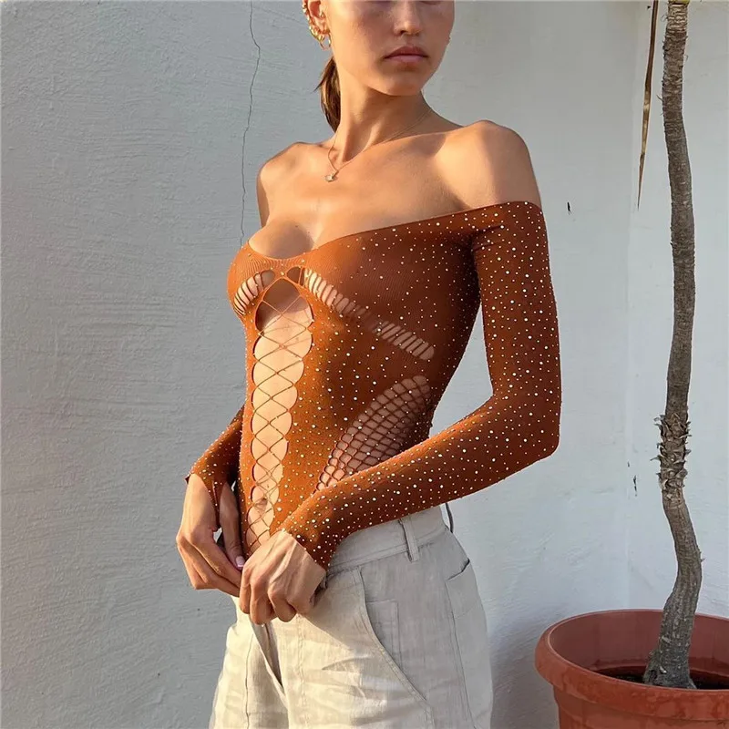 Gaono Sexy Bodysuits Women Long Sleeve Rhinestone Off-shoulder Hollow Out Mesh Bodycons Party Club Leotard Top Streetwear