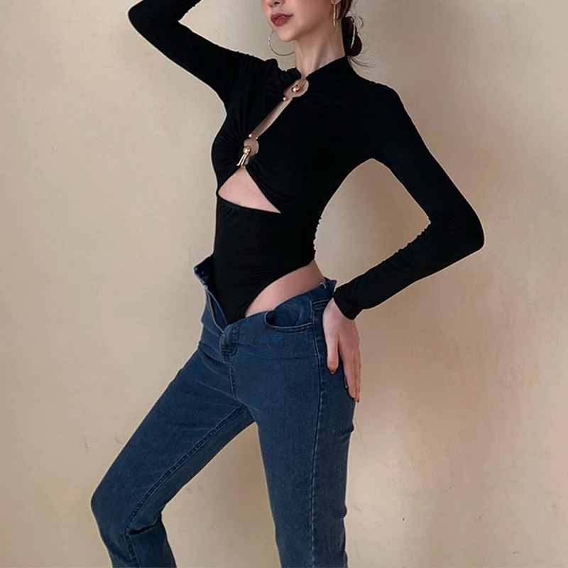 Women's bodysuit, solid long sleeve hollow bodysuit with metal ring, suitable for spring and autumn season, black