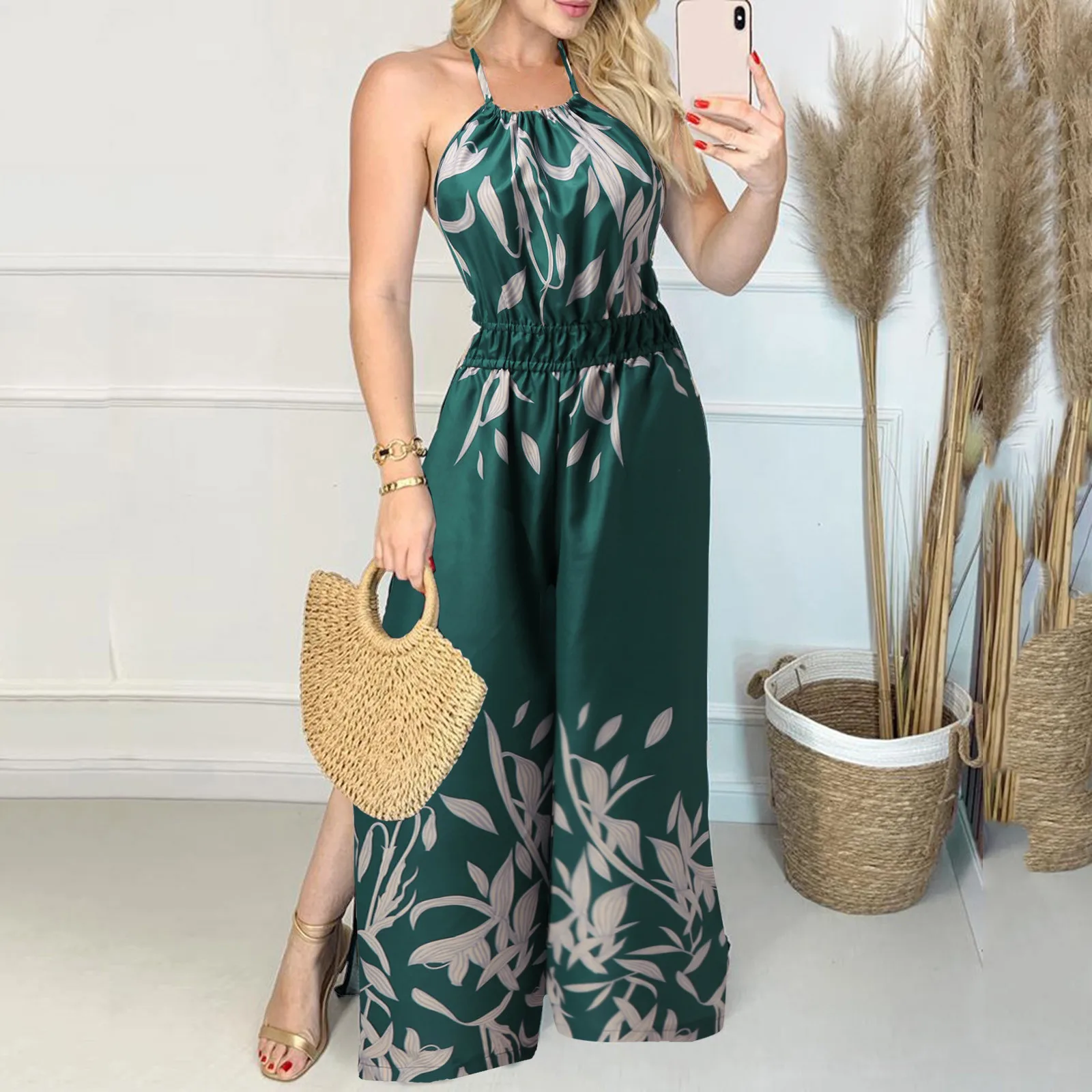 Necks Body Women Daily Summer Casual V Neck Sleeveless Halter Floral Leaf Print Split Halter Backless oversized Women Jumpsuit