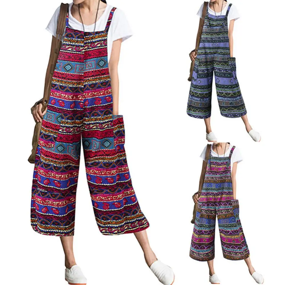 Women Retro Jumpsuits Rompers Elegant Sleeveless Printed Pockets Bib Loose Overall Playsuits Wide Leg Pants Streetwear