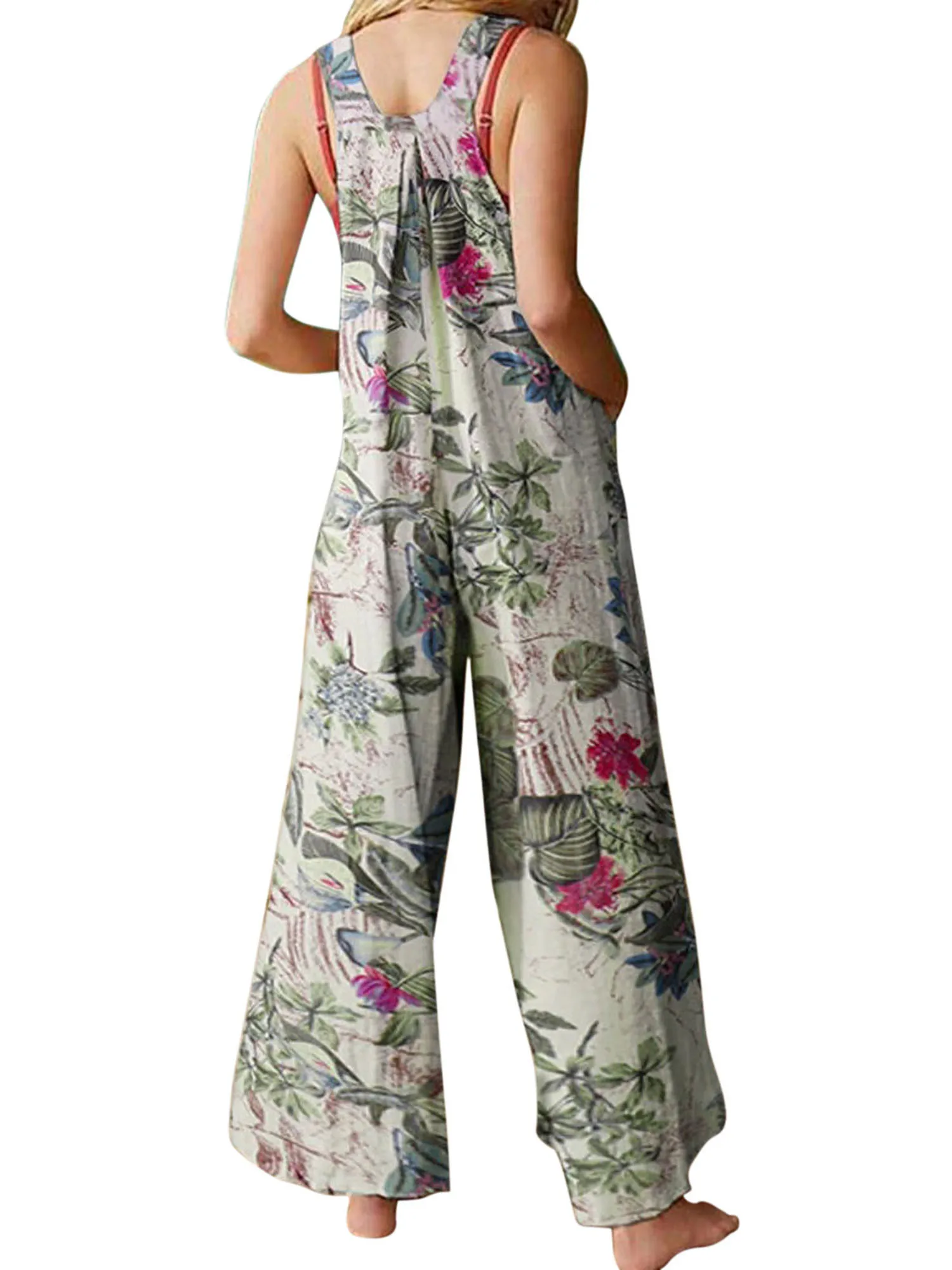 5XL Women Jumpsuit Vintage Leaf Floral Print Square Neck Sleeveless Rompers Overalls with Pockets Y2k Harajuku Club Streetwear