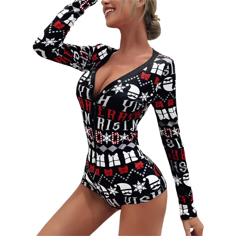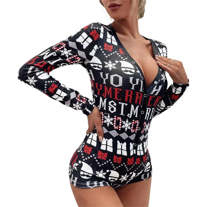 Christmas Pajama Rompers for Women V Neck Long Sleeve Button Down Letter Print Shorts Jumpsuit Sleepwear Nightwear