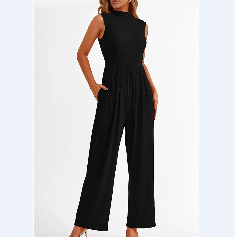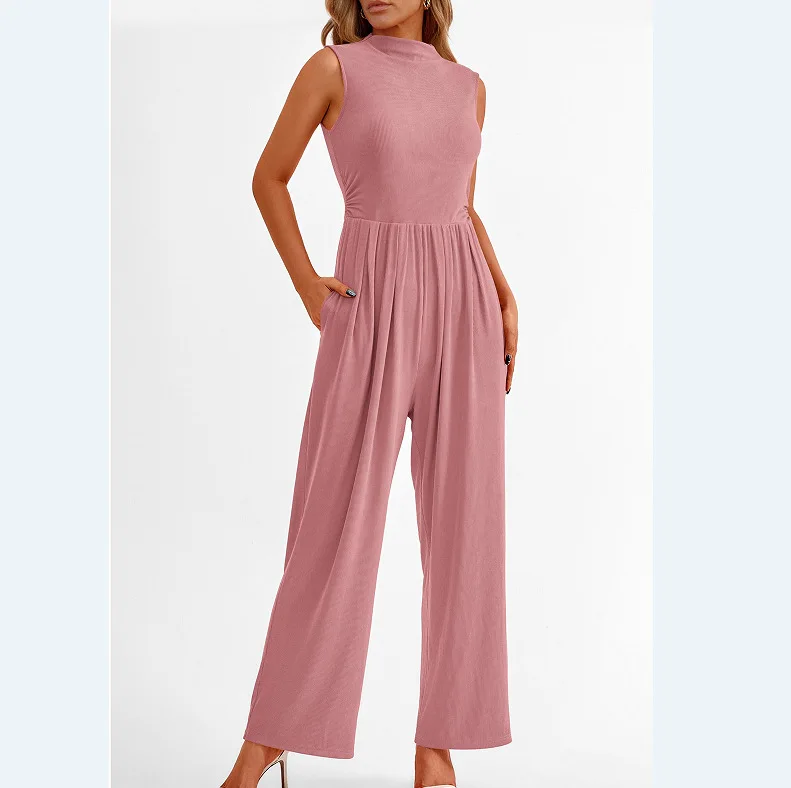 Women Jumpsuits One Piece O Neck Sleeveless Rompers Overalls Solid Wide Leg Pants Pockets High Waist Ankle Length Basics