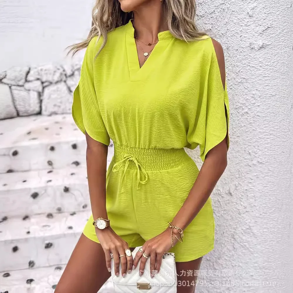Playsuits Women V Neck Short Sleeve One Piece Lace Up Tight High Waist Rompers Elegant Splice Overalls Hollow Out Jumpsuits