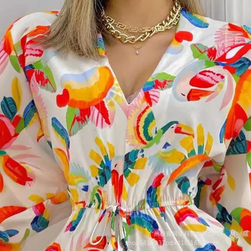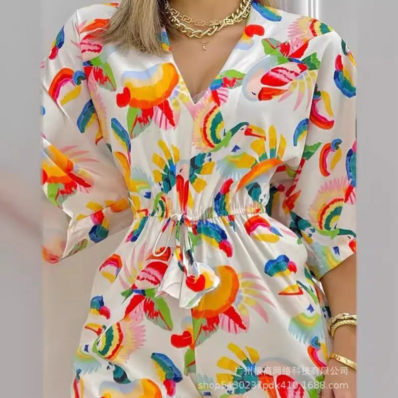 2024 Summer New Women's Clothing V-neck Half Sleeves Tropical Printing Fitted Waist Jumpsuit