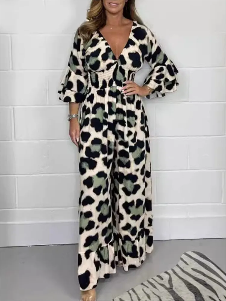 2024 Women's Autumn New Fashion Leopard Print Sexy V-neck Casual Horn Sleeve Elastic Waist Loose Comfortable Jumpsuit