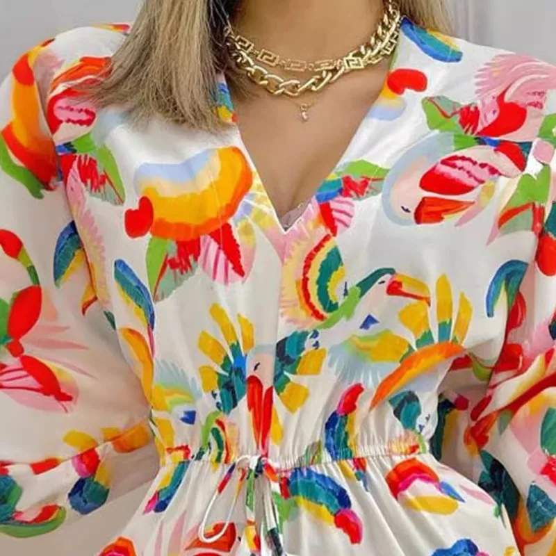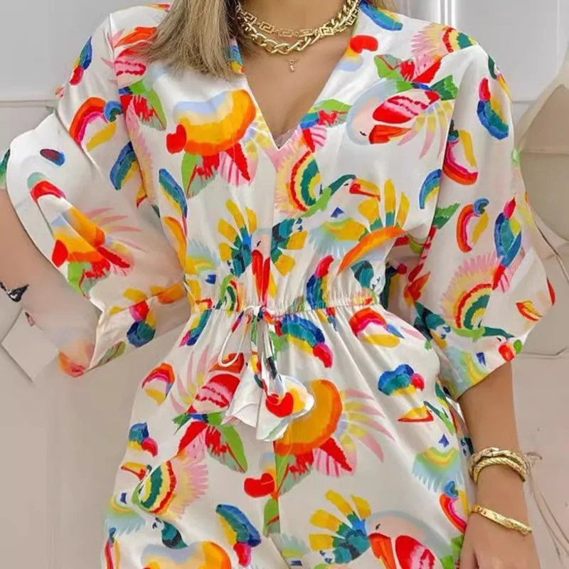 2024 Spring Summer New Women's Clothing Tropical Printing V-neck Tight Waist One-Piece Shorts