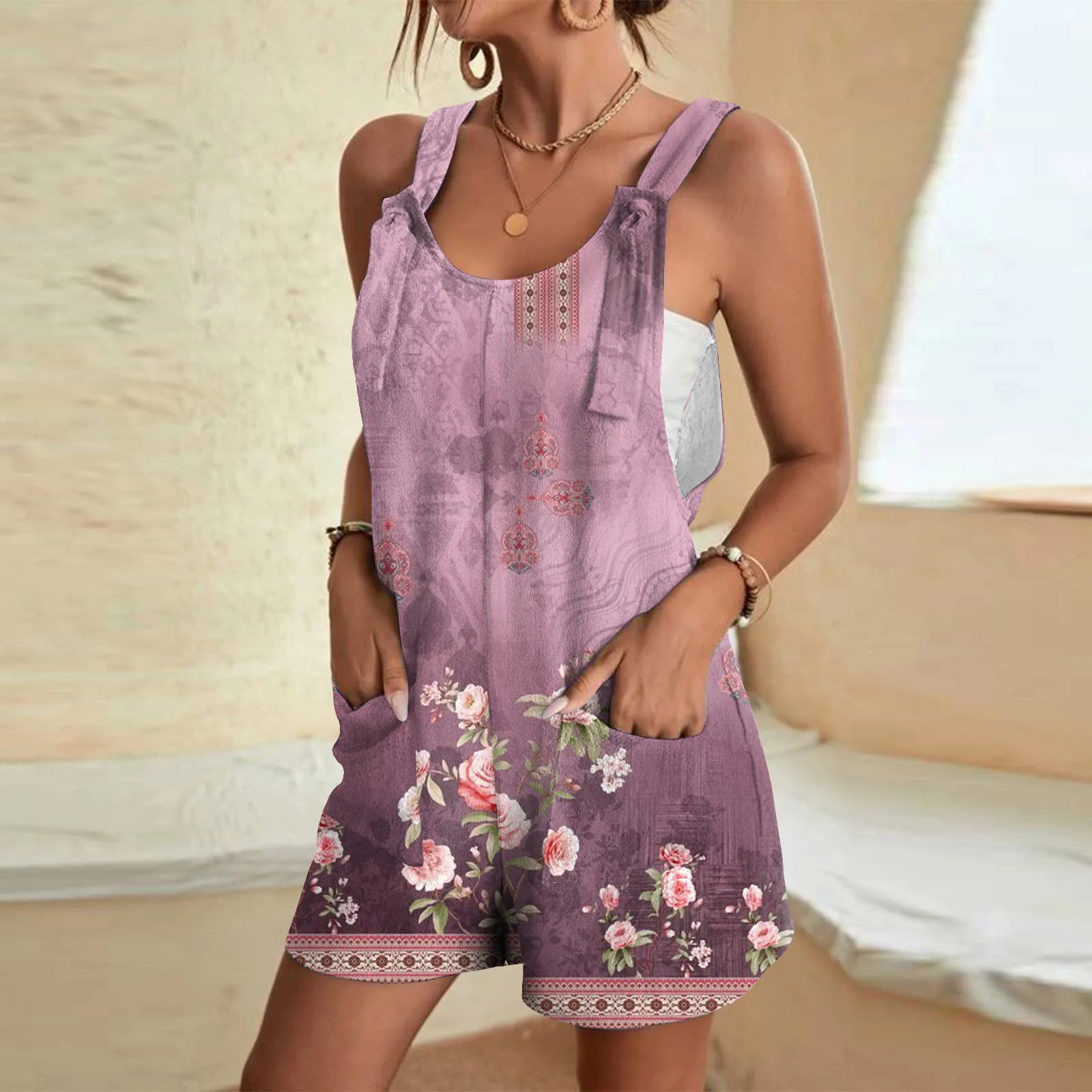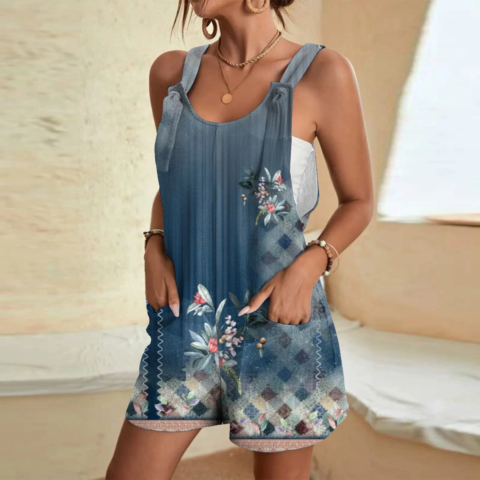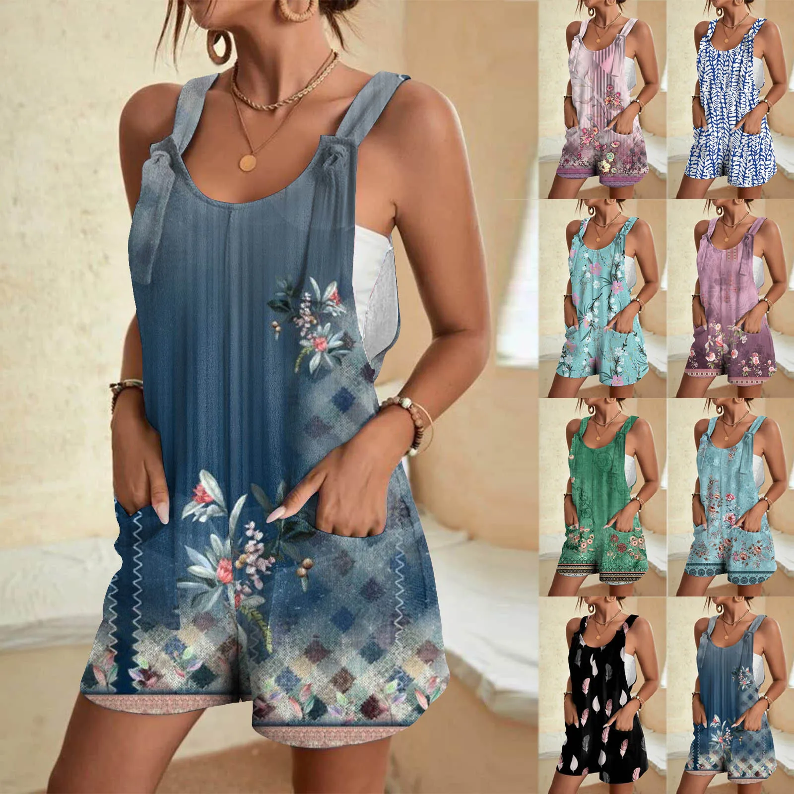 Women’s Fashion Tank Short Jumpsuit Summer Casual Fashionable Sleeveless Printed Pocket Jumpsuit Shorts Jumpsuit Overalls