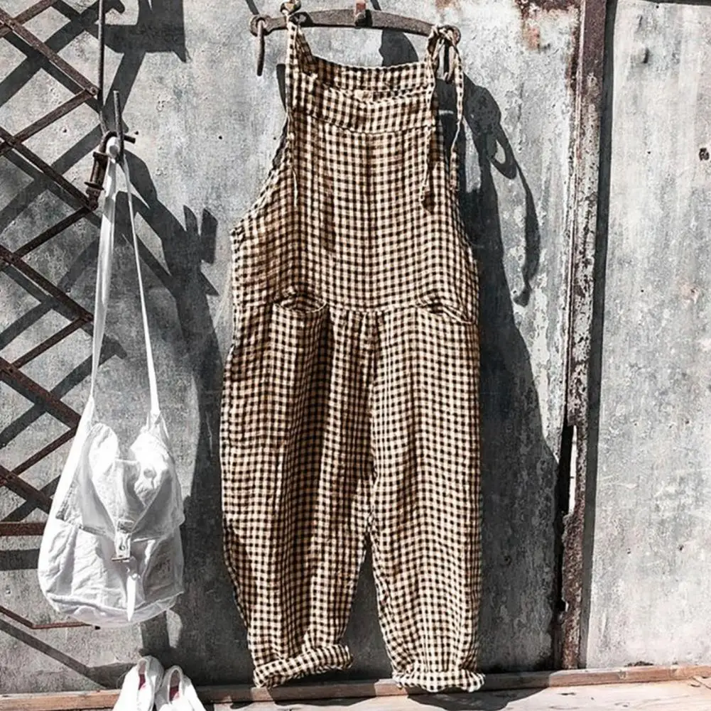 Plaid Print Overall Loose Fit Jumpsuit Plaid Print Deep Crotch Backless Jumpsuit with Pockets Casual Stylish Women's Daily Wear