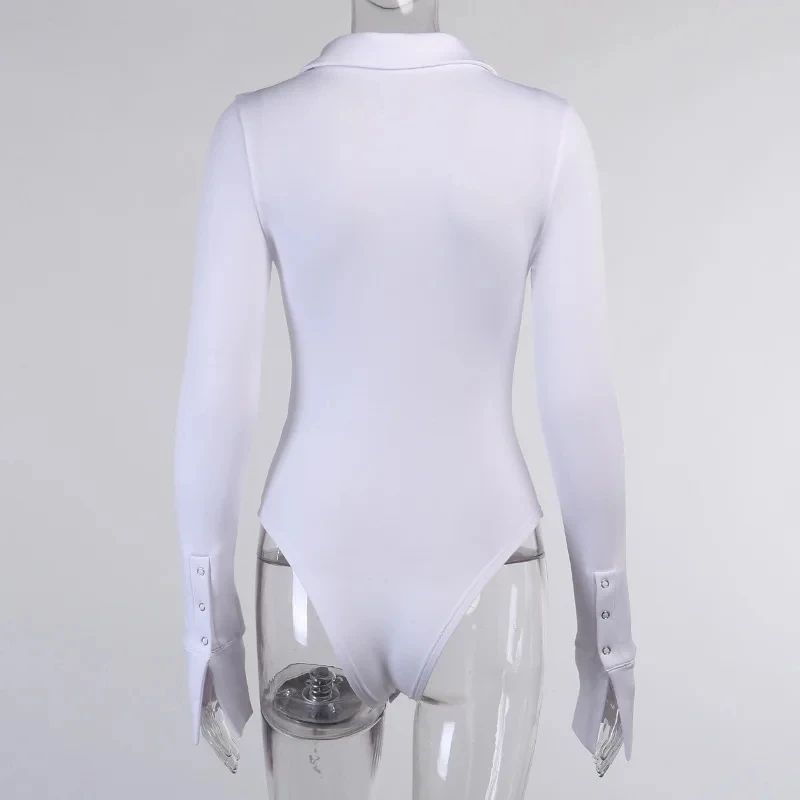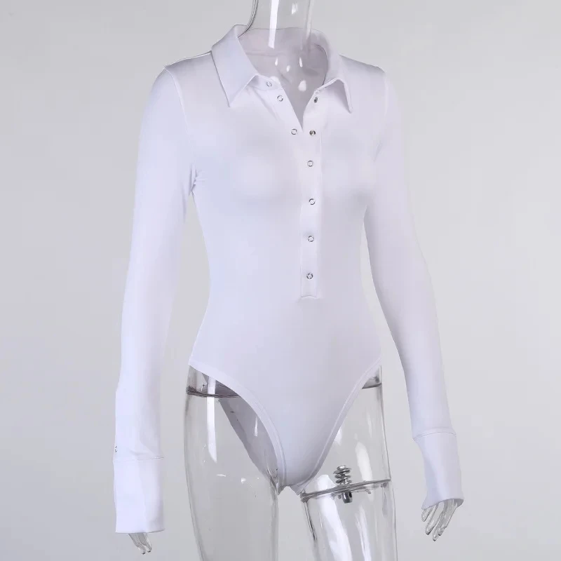 Street women's spring/summer fashionable sexy black top tight fitting long sleeved button up foldable collar jumpsuit
