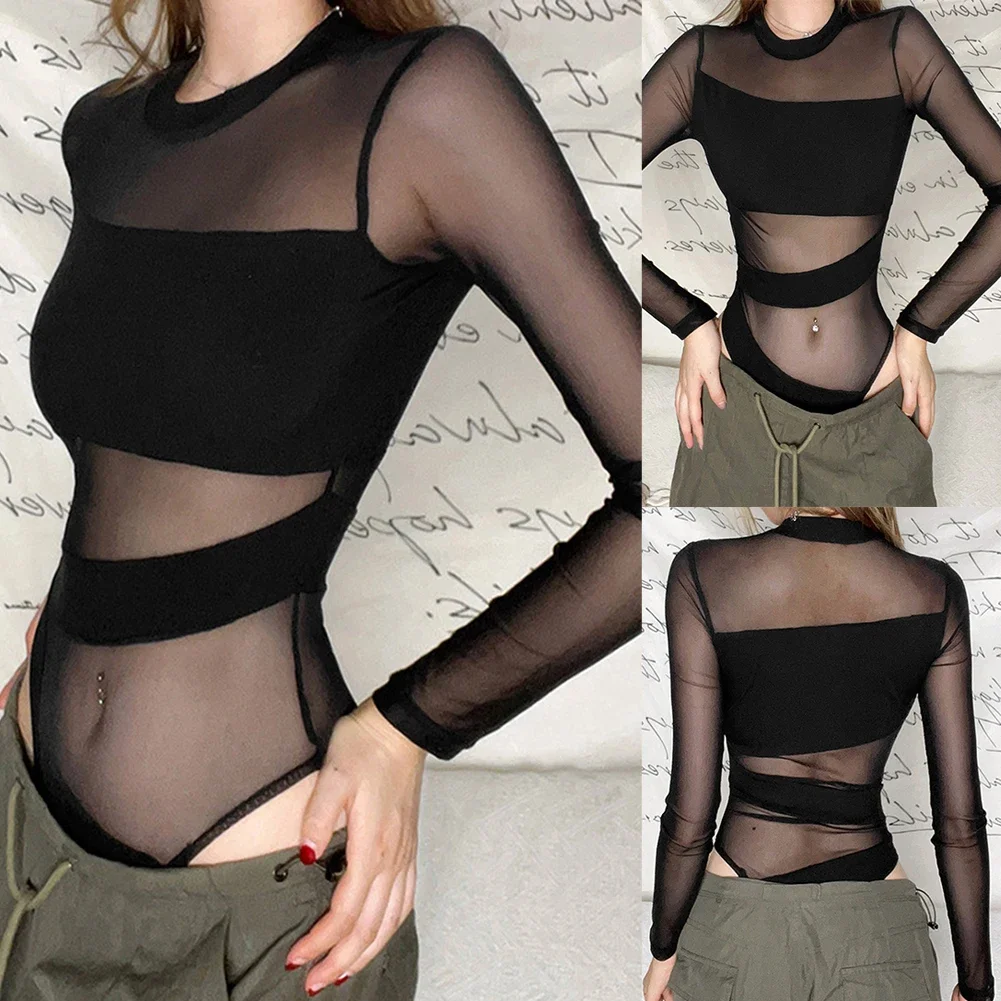 Cross-cut Hollow Jumpsuit Long-sleeved Bodysuit Black Mesh See Though Tops