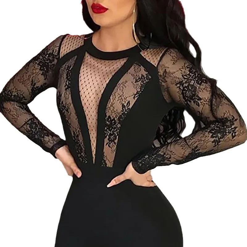 Fashion Rompers Womens Jumpsuit New Black Sexy Deep V Lace Long Sleeve Bodysuit for Women