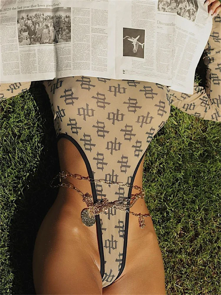 Summer Women Sexy Vintage Bodysuits Leotard Top Mesh Sheer Long Sleeve High Cut Bodysuit Letter Printed Skinny Playsuits Female