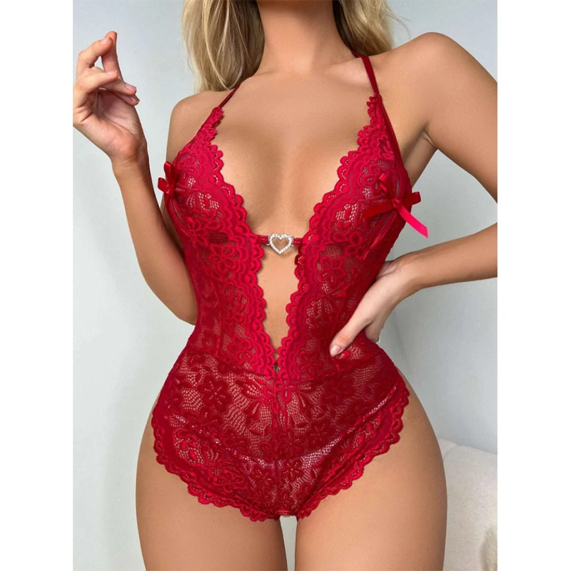 Name | Summer Women Transparent Floral Lace Bodysuits Sleepwear Erotic Tight One Piece Catsuit Backless Skinny Halter Strappy Rompers |