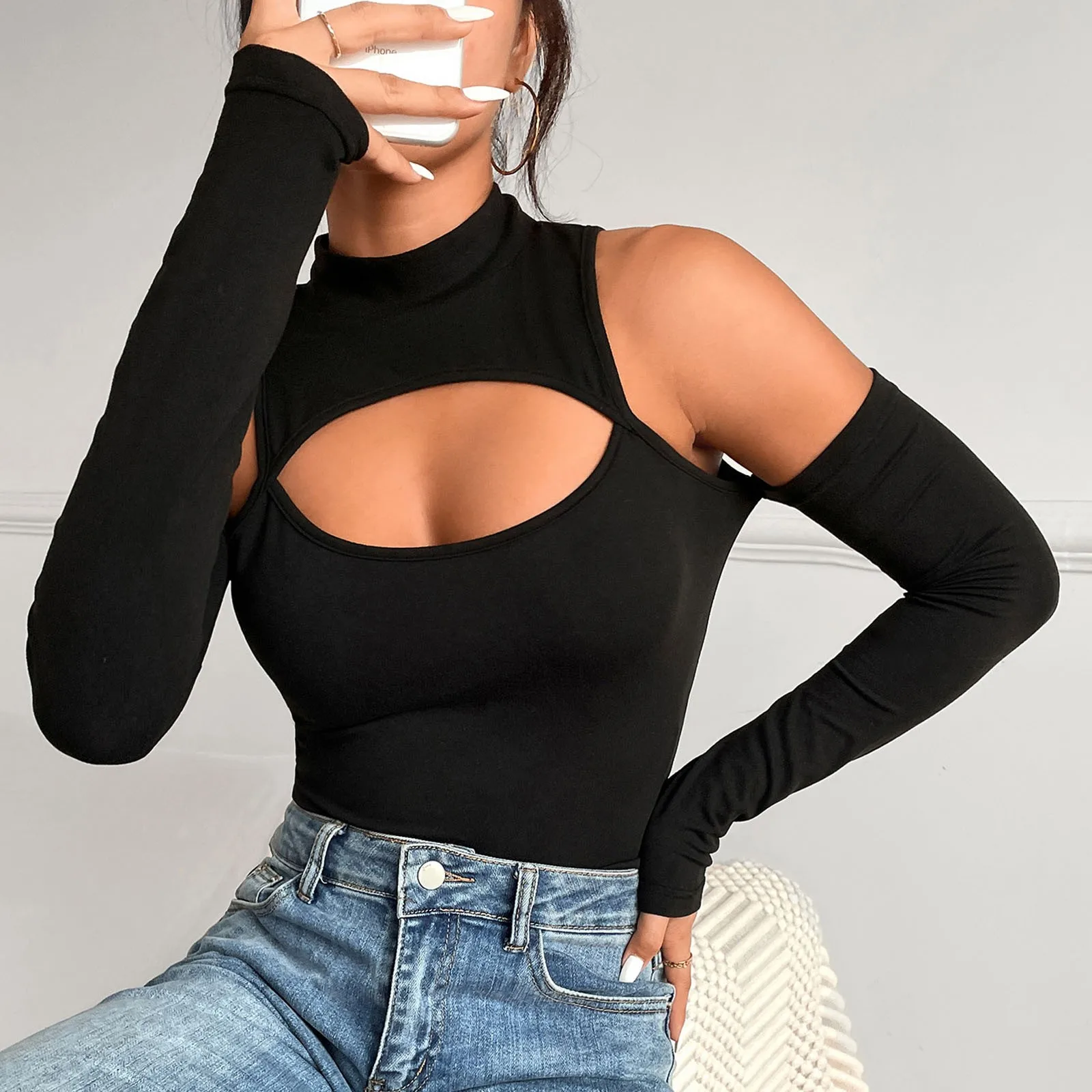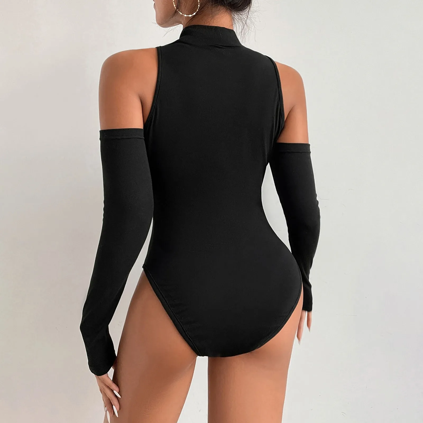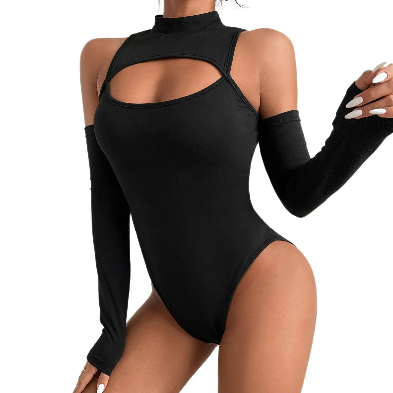 Women's Sexy Polyester Underwear Crew Neck Long Sleeve Leggings Slim Fashion Jumpsuit Bodysuit Top Chest Leakage Hollow Out