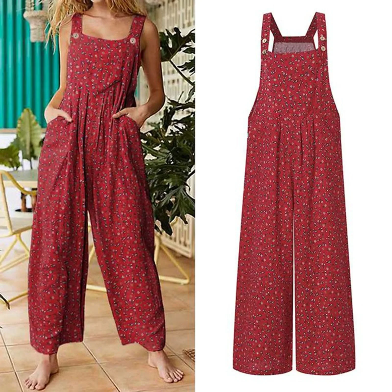 Summer New Women Casual Loose Flower Print Jumpsuits Women's Overalls Boho Sleeveless Square Collar Jumpsuits Rompers