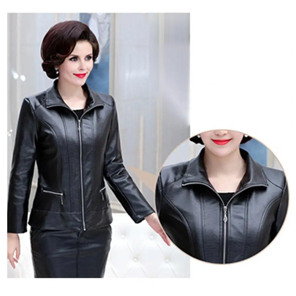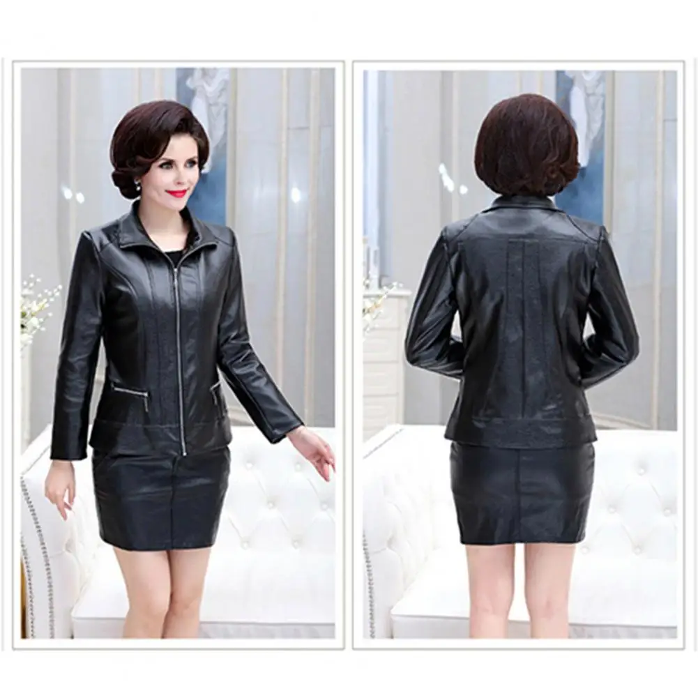 Faux Leather Coat Slim-fitting Leather Jacket Stylish Mid-aged Women's Faux Leather Motorcycle Jacket with Zipper for Travel