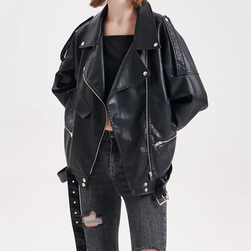 Winter Women Faux Soft Leather Jacke tNew Fashion Loose Coat Turndown Collar Zipper Motorcycle Female Rivet Punk Overcoat