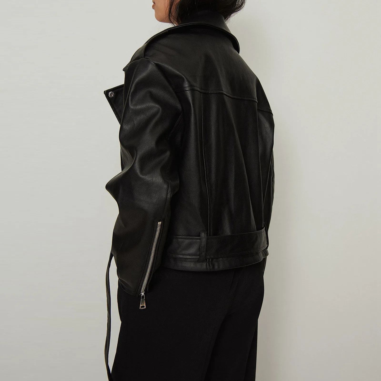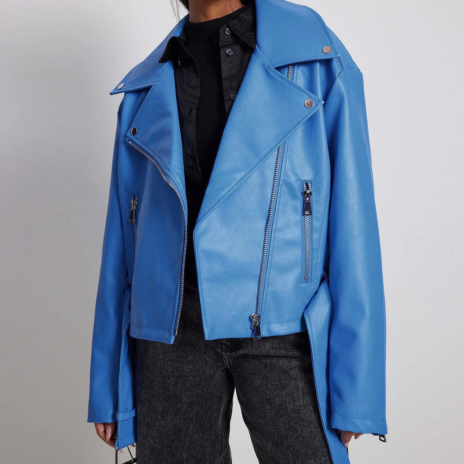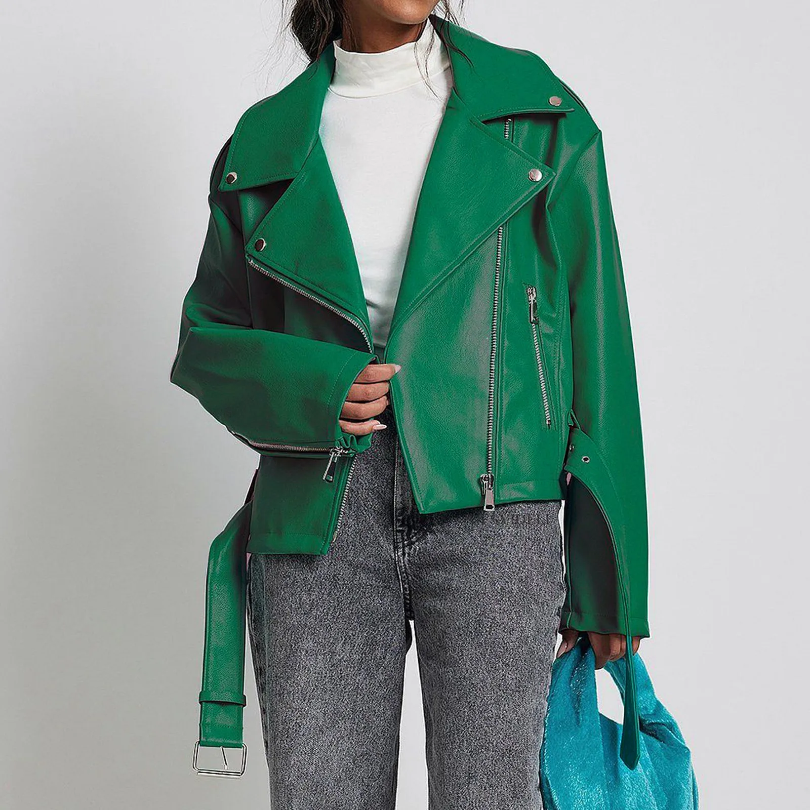 Women Vintage Leather Short Belted Turn Down Jacket Female Cool Zipper Lapel Retro Coat Outwear Abrigos Invierno Mujer 2024