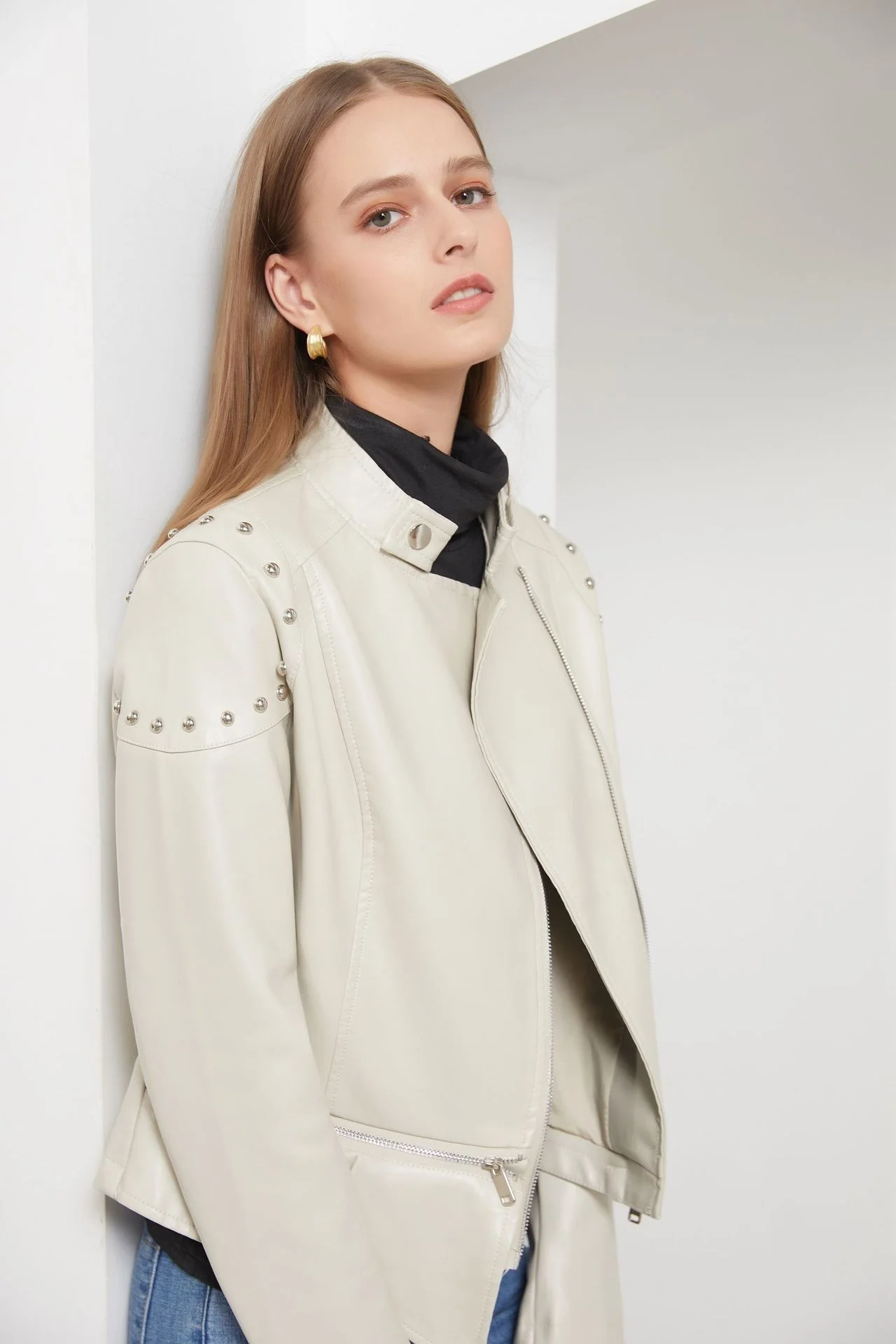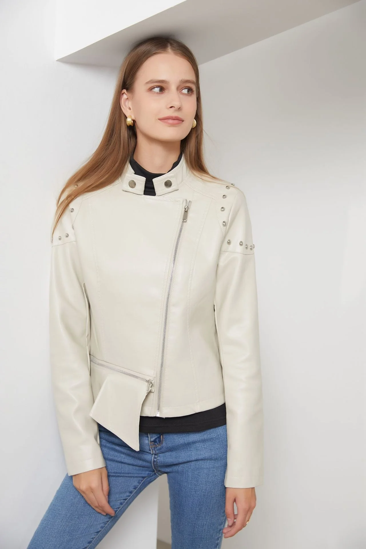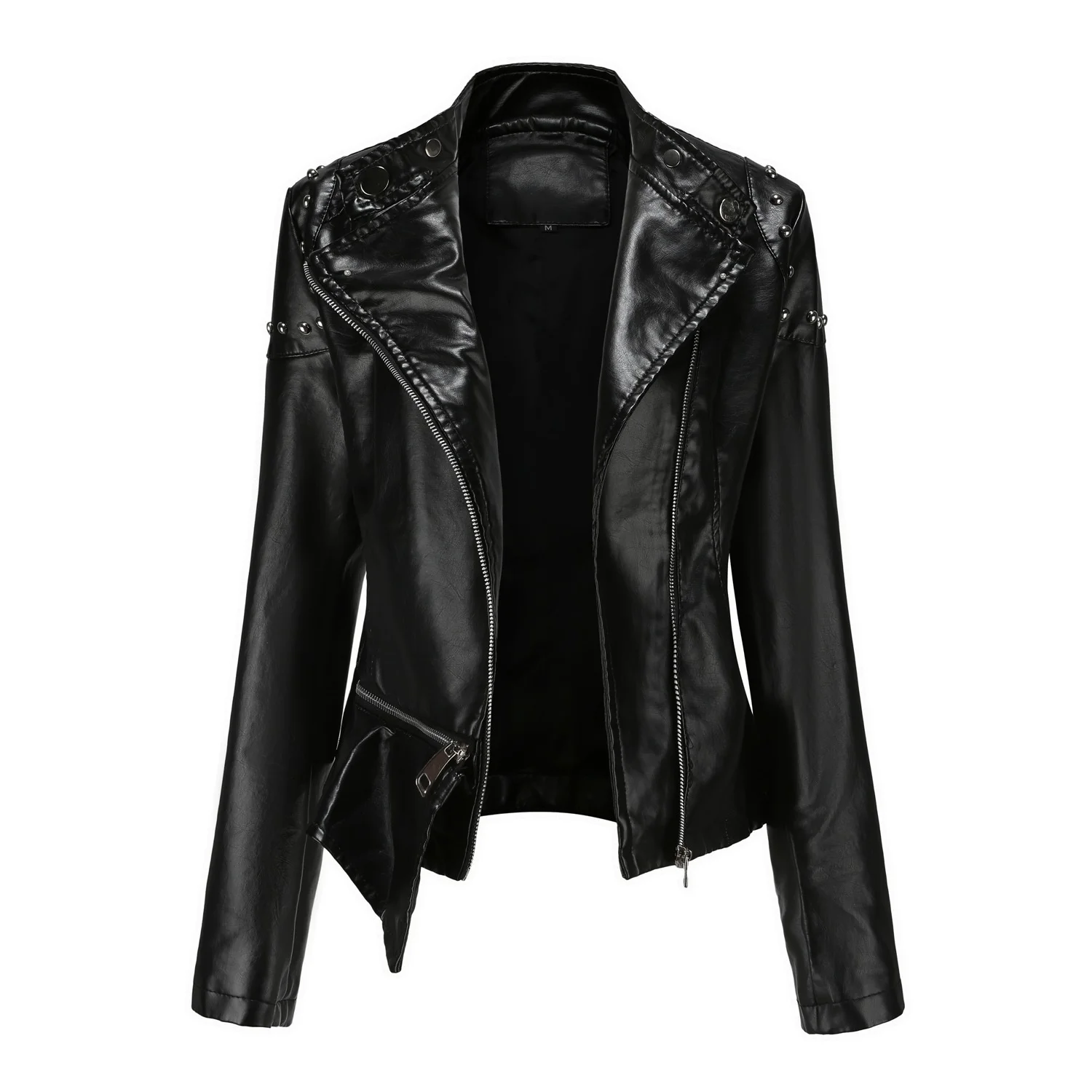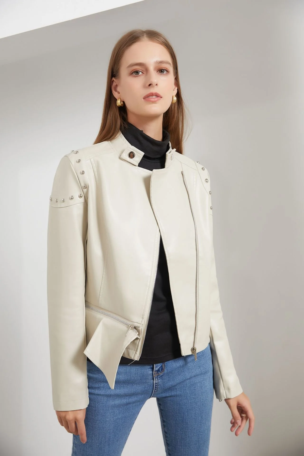 2024 New Rivet Fashion Standing Collar Leather Coat Women's Solid Color Jacket Women's Spring and Autumn Coat Women's Rivet