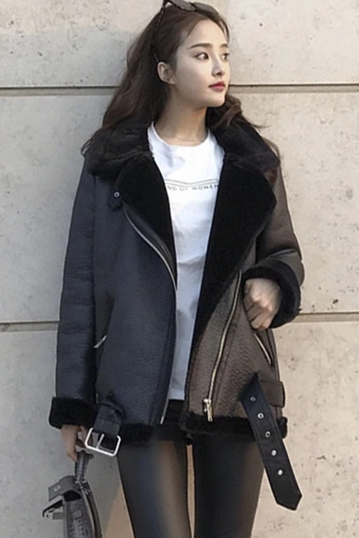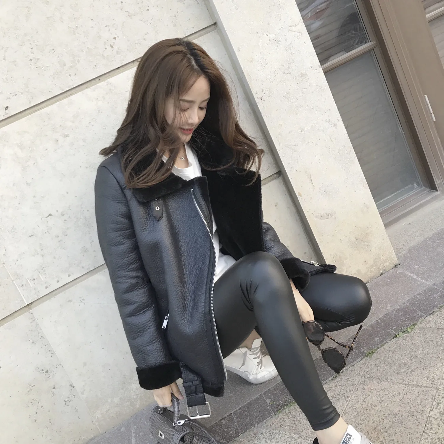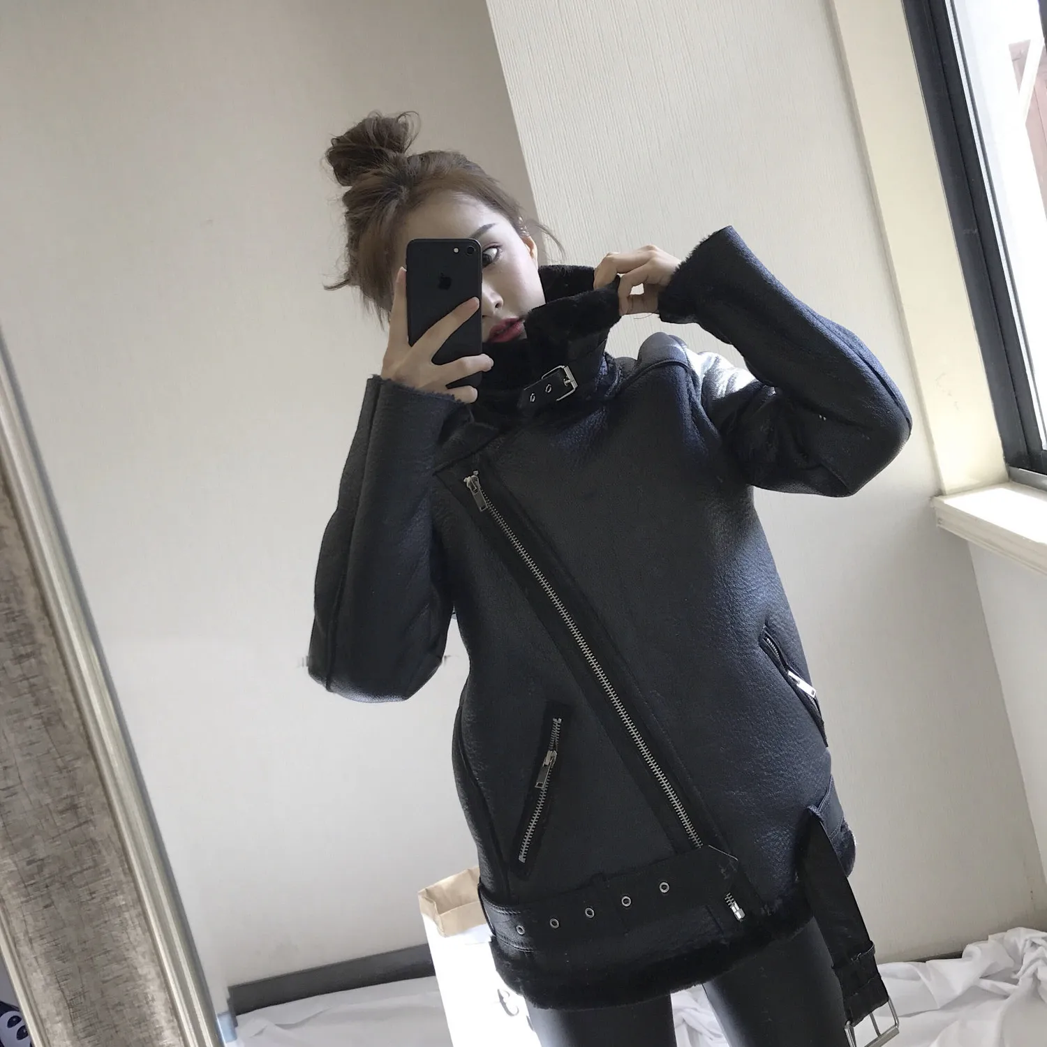 Women beige fur faux leather jacket coat with belt turn down collar Ladies 2019 Winter Thick Warm Oversized Coat