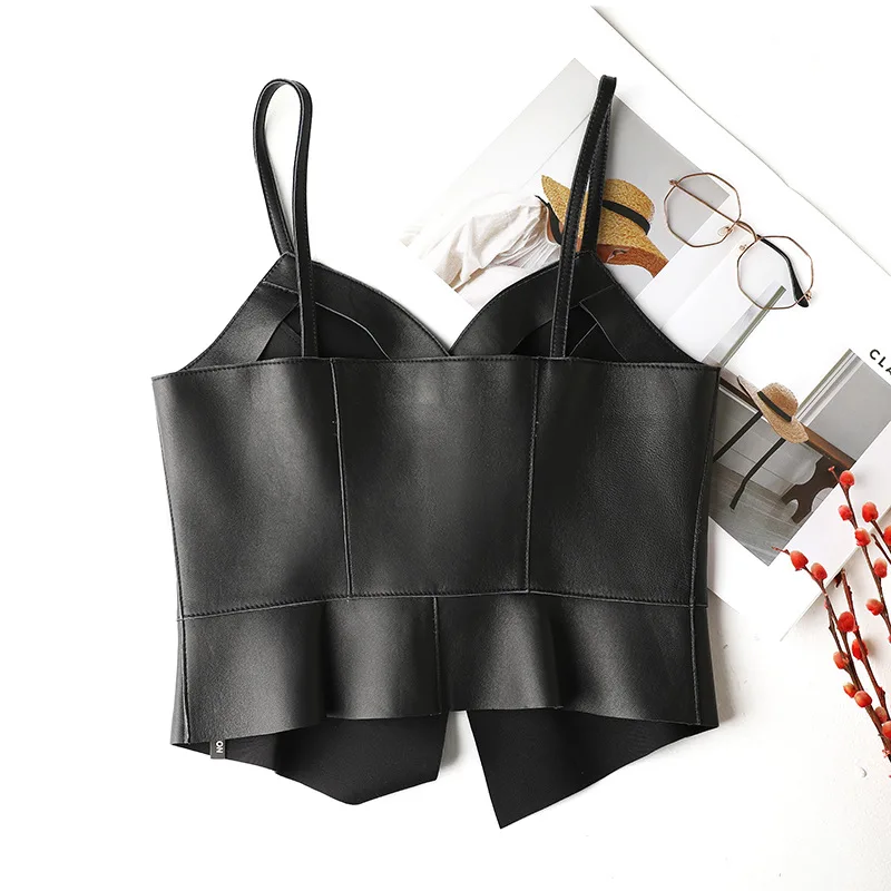 2023 New Style Women's Single Breasted Design Slim Waist Genuine Sheepskin Leather Small Sling Vest