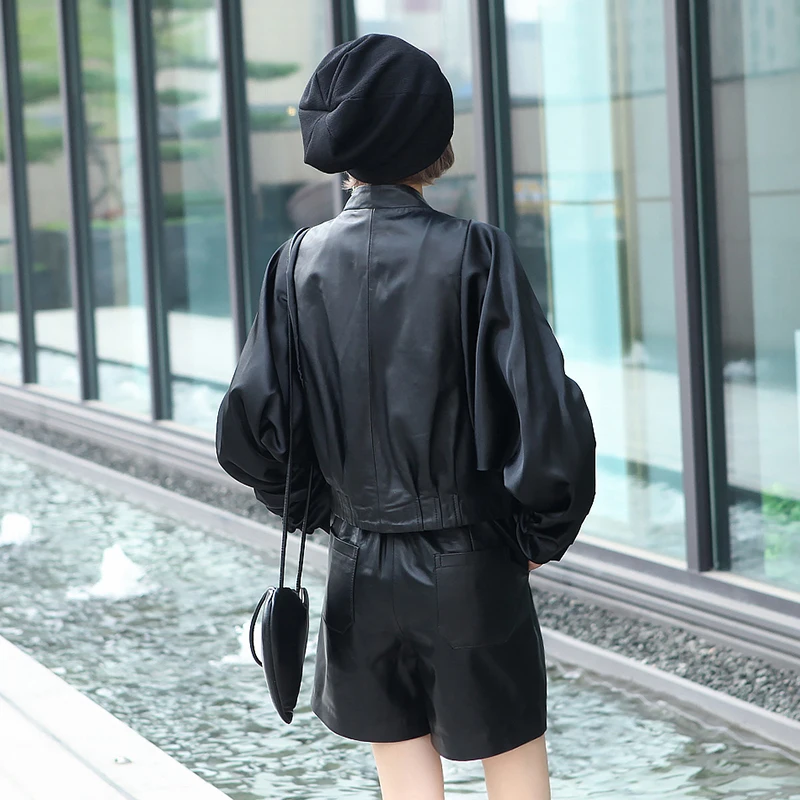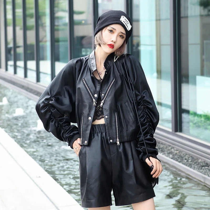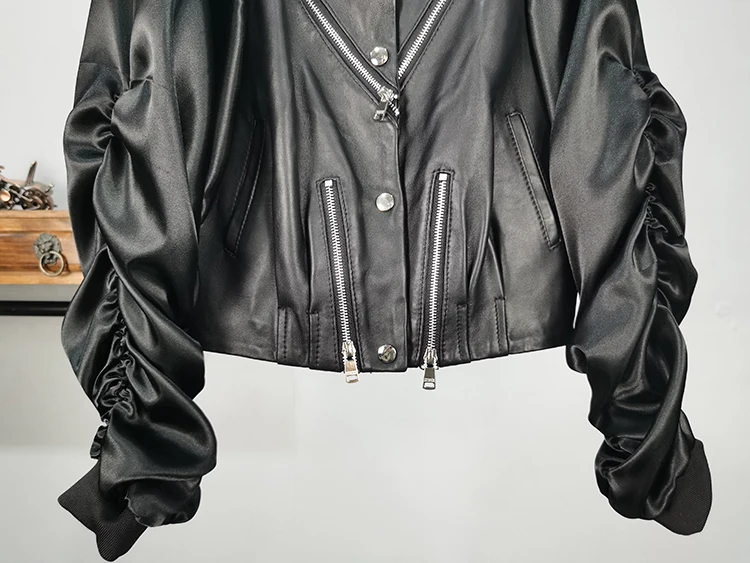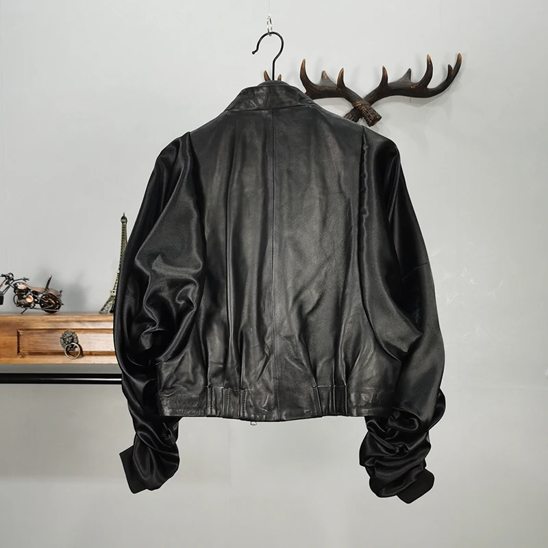 3XL 2XL Autumn Winter New Genuine Real Leather Jacket Women Sheepskin Patchwork Sleeves Short Leather Jacket Loose Zipper Coat