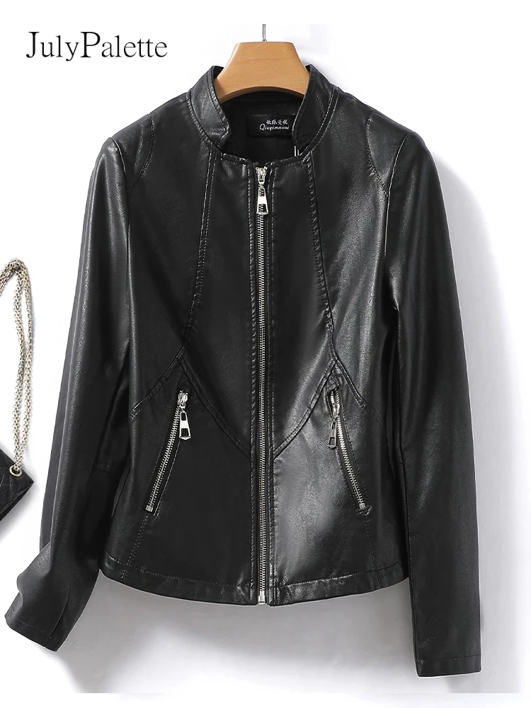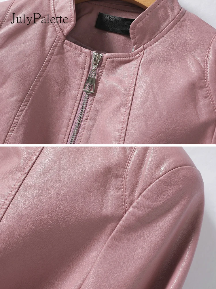 Julypalette Pink Stand Collar Split Leather Jackets 2022 Fall Zipper Pocket Long Sleeve Coats Casual Female Sheepskin Outwear