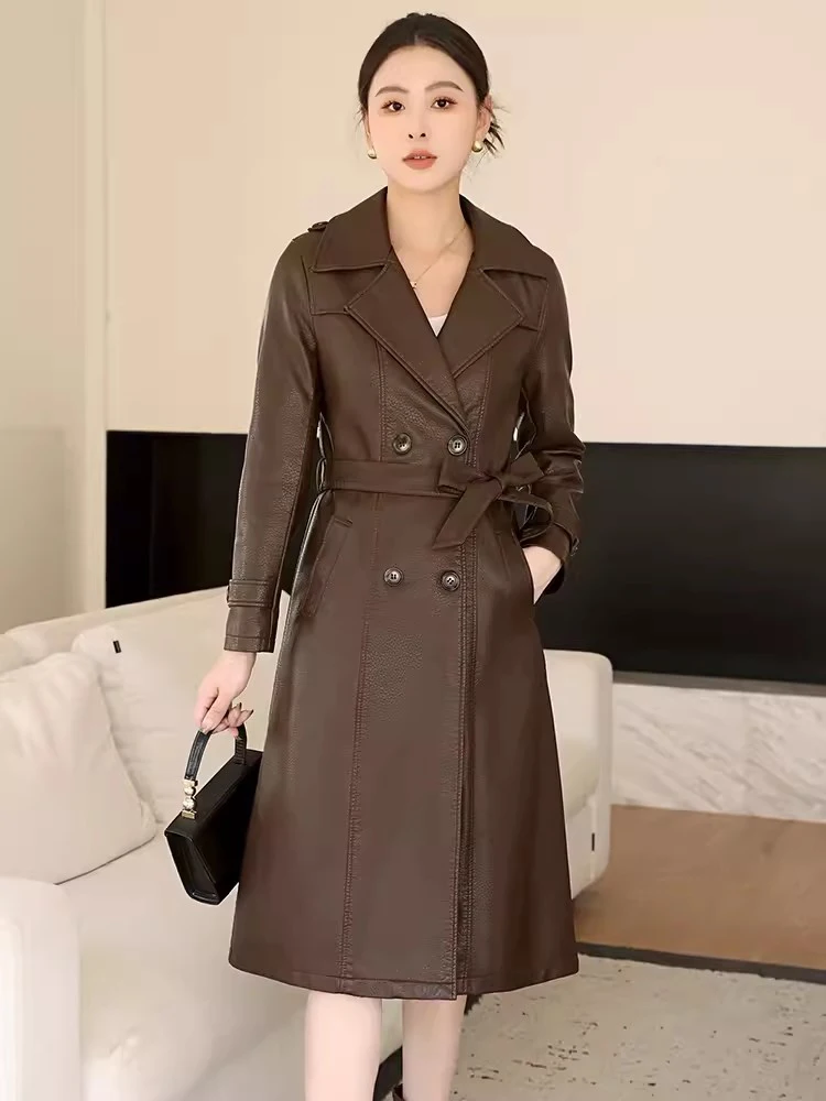 New Women Spring Autumn Leather Coat Fashion Turn-down Collar Double Breasted Slim Sheepskin Coat Split Leather Trench Coat