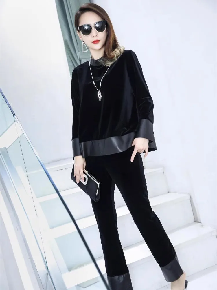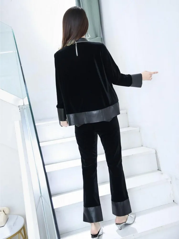 2023Women Autumn Velvet Patchwork Genuine Leather Tops Stand Collar Loose Fit Coat Office Ladies Casual Outwear Jacket Streetwea
