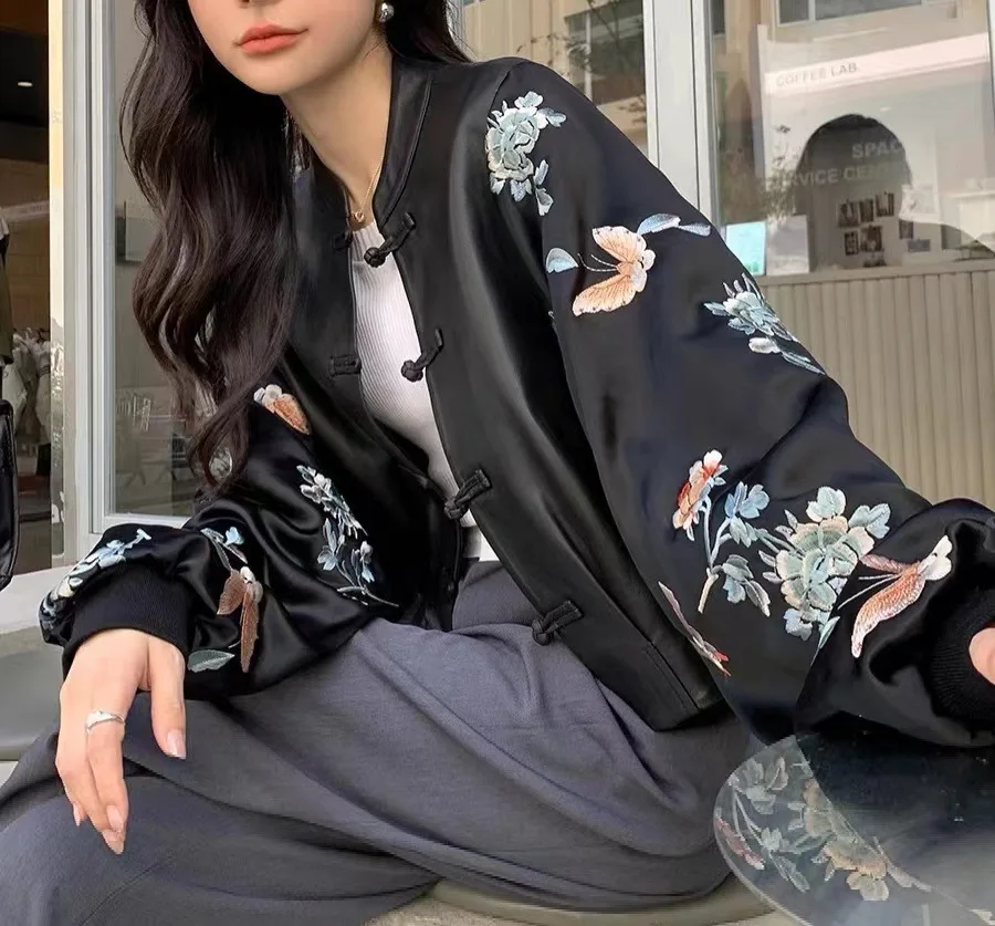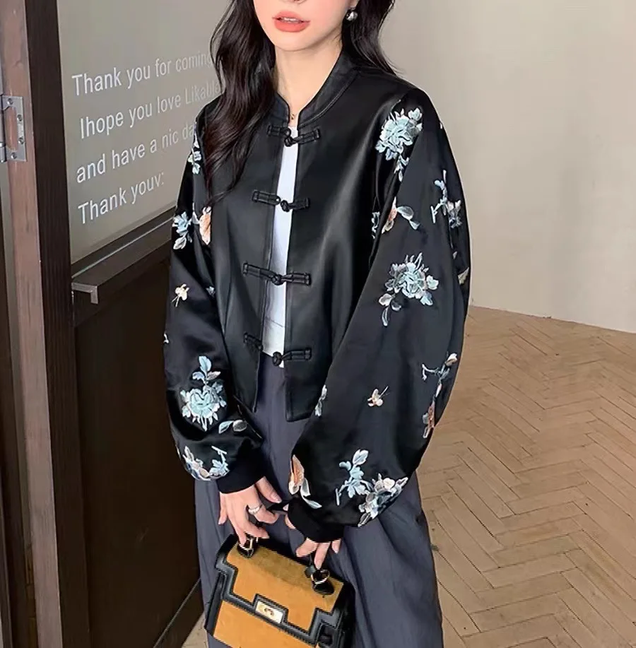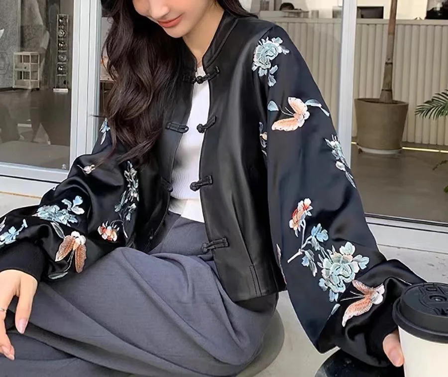 2024 New Arrival Chinese Style Women Genuine Sheepskin Leather Embroidery Jacket