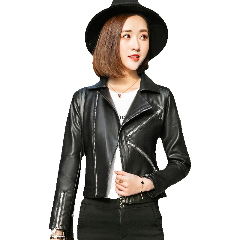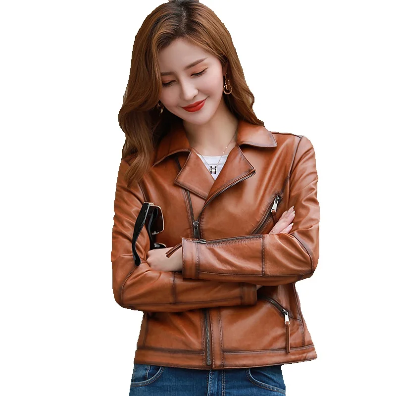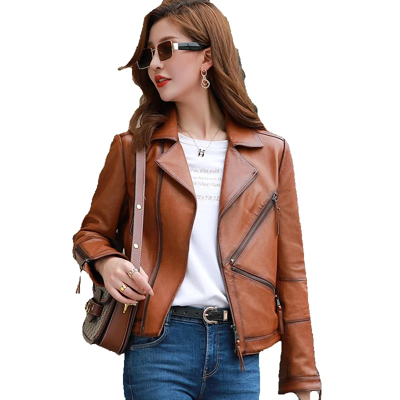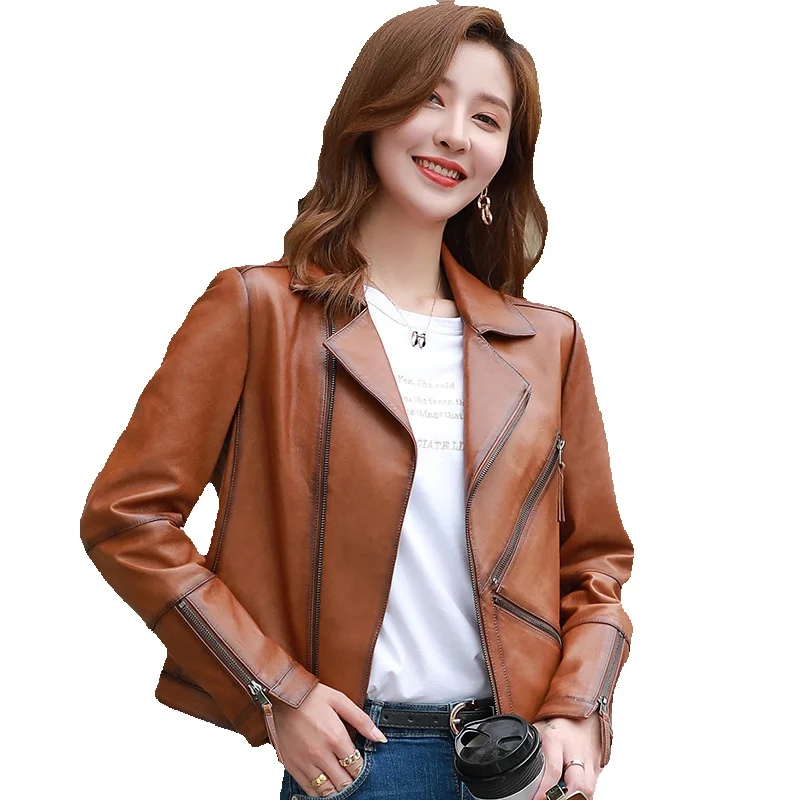 New Spring Genuine Leather Coat Women's Short Sheepskin Slim Fit High Waist Suit Collar Coat Motorcycle Jacket Women's