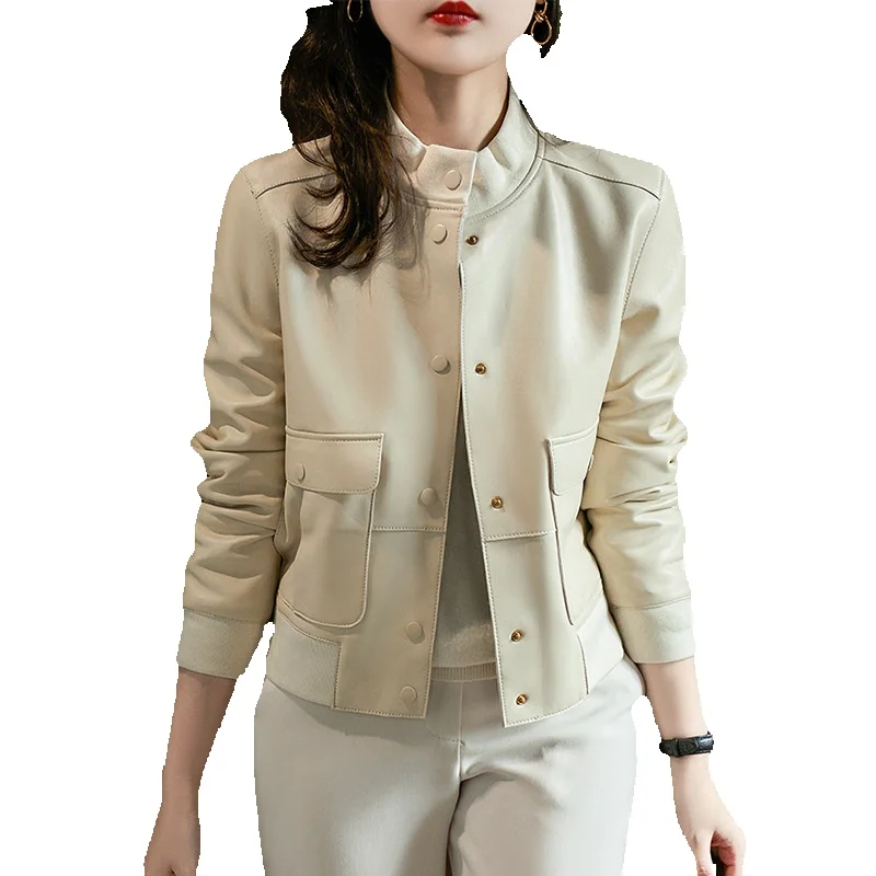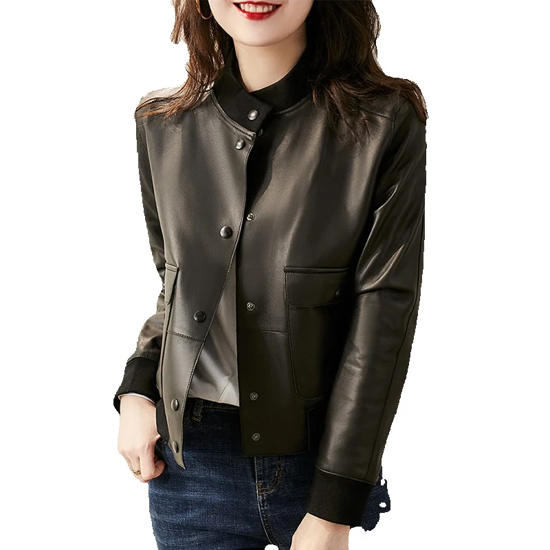 New Style Round Neck Thread Trimmed Sheepskin Genuine Leather Coat For Women