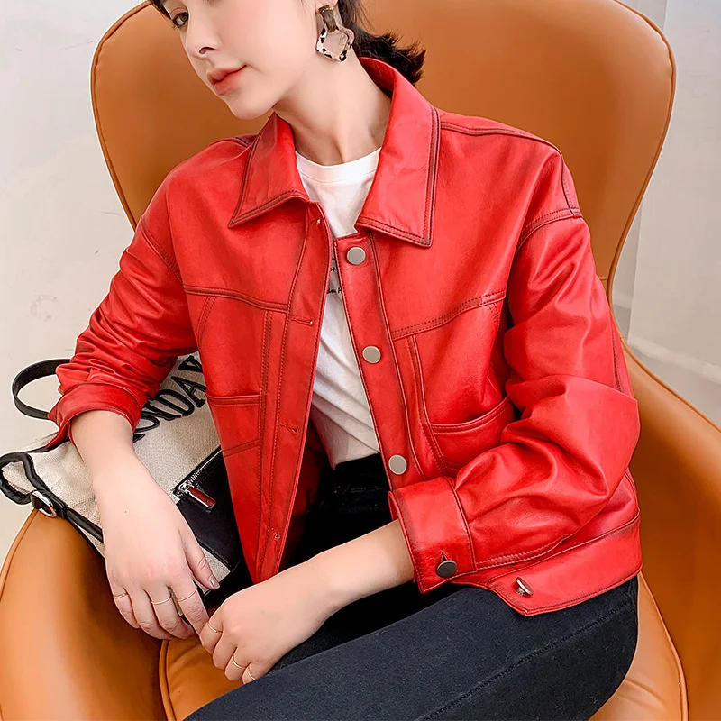 Real 2023 Short Leather Jacket Women Red Sheepskin Leather Jacket Korean Casual Coat Spring Autumn Cuero Genuino